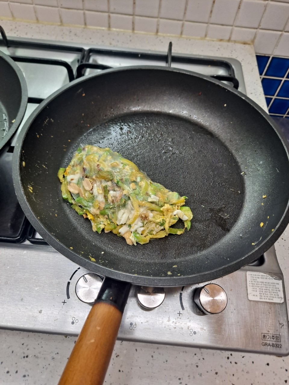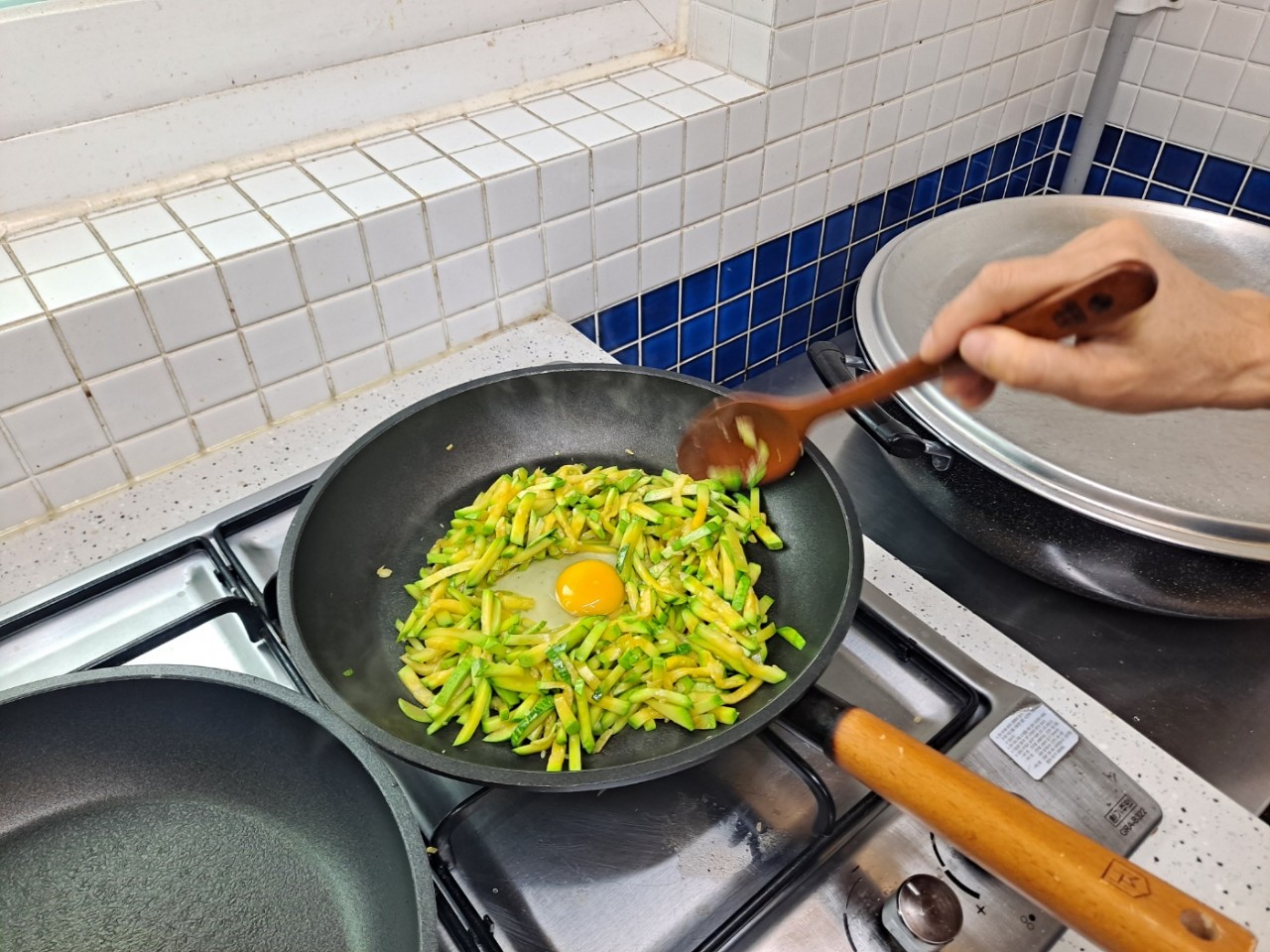 2) 애호박을 숨이 죽게 볶다가 계란을 간하여 풀어서 채 썬 호박에 부어 같이 볶습니다.