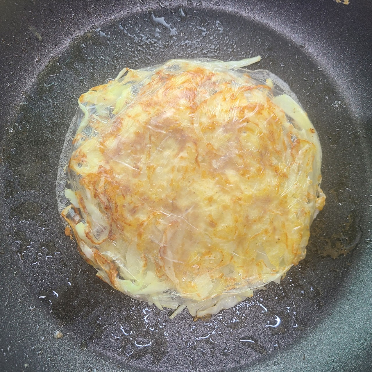 2) 후라이팬에 라이스페이퍼를 두세 장 정도 깔고 반죽한 양배추를 올리고 약불에서 뚜껑 덮어 익힙니다.