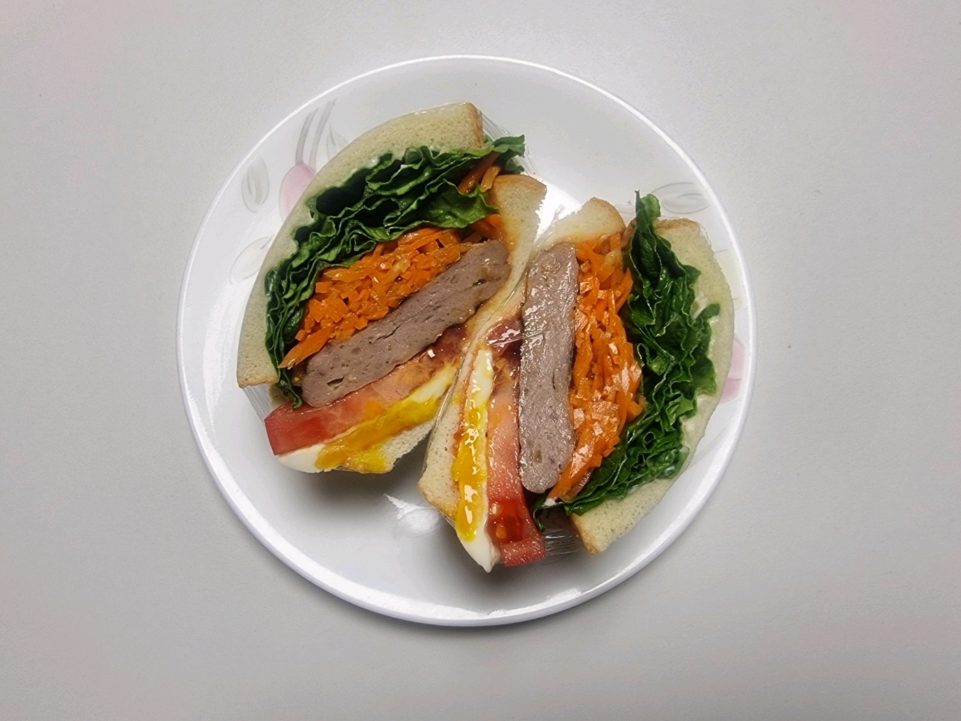 5. 식빵에 한쪽은 마요네즈, 다른한쪽에는 딸기쨈 바르고 청로메인, 당근 라페, 함박 스테이크, 토마토, 달갈 등을 차례로 올리고