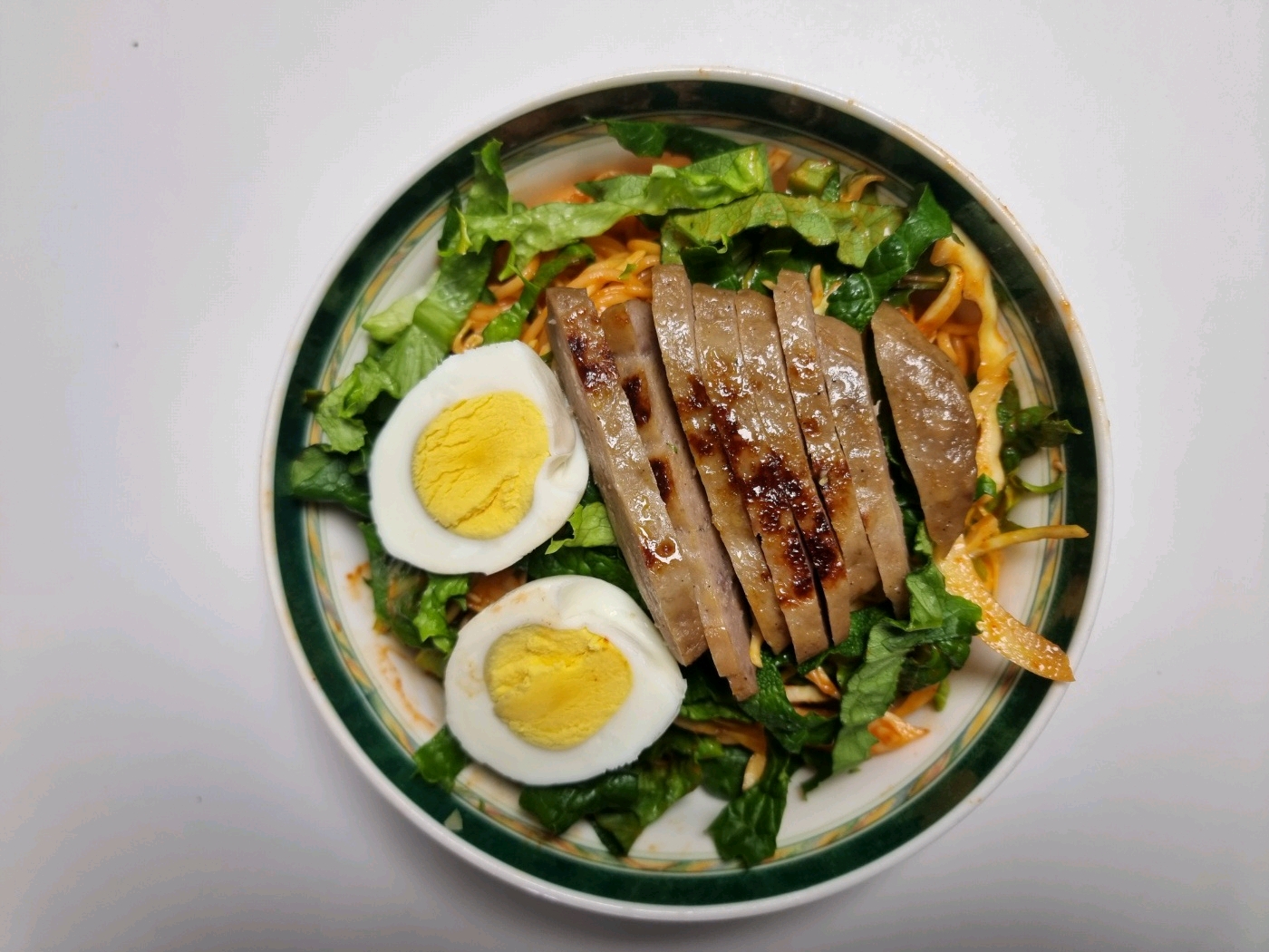 4.청로메인과 토마토를 밑에 깔고 달걀, 스테이크, 견과를 올려서 소스를 뿌리면 끝!