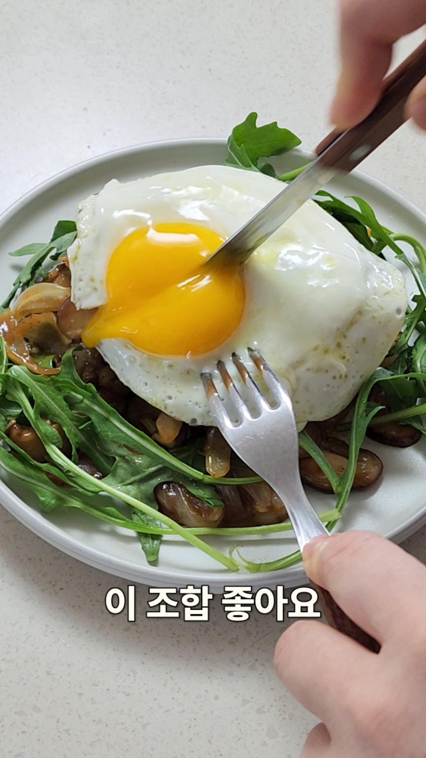 그릇에 밥을 담고 함박, 소스, 계란을 차례로 올리고 루꼴라를 곁들이면 완성이에요.