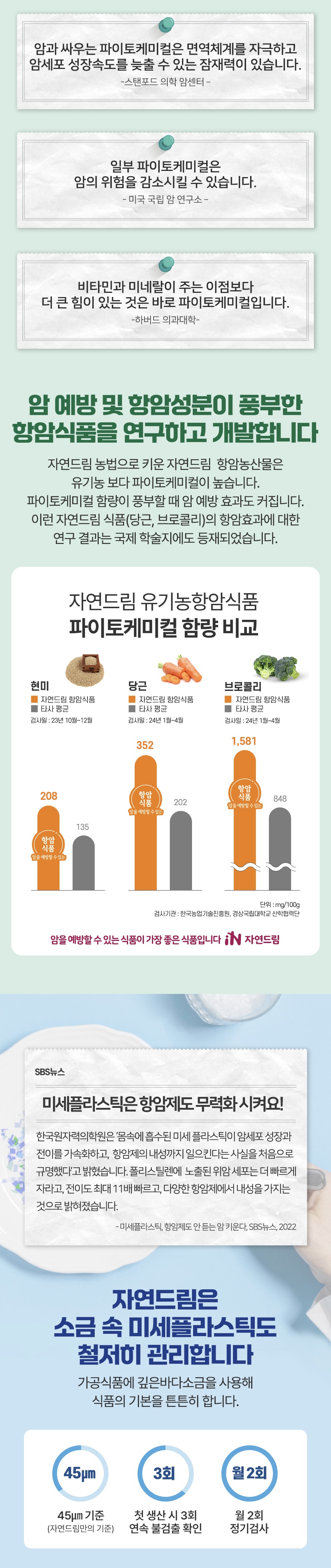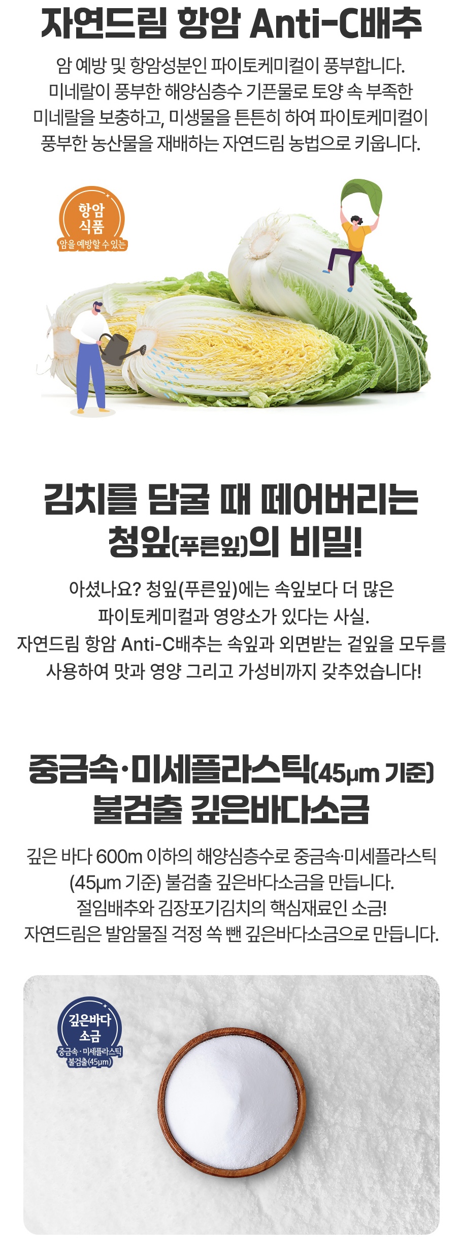 | | 물품특징 | | - 자연드림농법으로 키운 배추로 만든 절임배추입니다. | | 생산과정 | | 자연드림농법 무농약 배추 계약재배 → 잔류농약검사 실시 → 계약산지 배추수확 → 배추 및 원재료 입고 선별 → 절단 및 배추 2차 선별 → 절임 → 3회 세척 → 선별/정선 → 금속검출기 검사 → 규격포장 (갈변현상을 막기 위해 탈수를 진행하지 않으며, 총 중량의 7%~10%이상 추가 포장하였습니다.) | | 이용방법 | | ① 화학조미료는 섬유질을 부드럽게 하는 성질이 있어서 김치를 빨리 무르게 해, 부패시키므로 많이 넣지 않는 것이 좋습니다.(액젓과 젓갈을 많이 넣을 경우도 쉽게 잘 물러짐) ② 김치온도가 4℃이상일 경우에는 숙성이 서서히 진행되어 질긴감이 없어지며 물러질 가능성이 있습니다. ③ 김치 절임시, 사용된 염분에 따라서 물러짐의 원인이 되기도 합니다.→ 김치를 너무 오래 절일 경우 배추의 수분이 줄어 조직이 흐물 거리게 됩니다. ④ 김치를 고온인 상태(김치를 밖에서 2~3일 정도)에서 익힌 후 바로 차가운 장소에 저장하거나 김치냉장고 익힘 코스로 보관하는 경우 물러지는 현상이 나타날 수 있습니다. 갑작스런 냉해로 인해 조직이 파괴되어 물러지는 현상이 발생되어 지므로 최대한 김치를 처음부터 일정온도(3~7도시)에서 보관을 하는 것이 좋습니다. → 김치냉장고 사용 시 “중”, 혹은“강”으로 온도 유지해 주십시오. ⑤ 저온에서 발효를 시키고 공기와의 접촉을 가능한 없애는 것이 중요합니다. ⑥ 통배추를 절이는 경우 가급적 10℃내외를 유지하는 것이 좋습니다. 평균 23~24도가 유지되고 있는 욕실에서 배추를 절이는 경우 김치가 무르기 쉽습니다.(연부현상) | | 기타사항 | | [자연드림농법이란] 토양 속에 부족해진 영양분을 이온미네랄로 보충하고 미생물을 풍부하게 만드는 자연드림만의 재배방식입니다. 농작물들이 스스로 병해충을 이겨내는 힘을 길러주고 미네랄과 황산화물질인 파이토케미컬 함량, 당도까지 높아져 맛이 아주 좋아집니다. 2025 김장 채소를 자연드림 농법으로 키우고 있습니다. [김치가 물러지는 이유] 김치는 발효가 진행되는 살아 있는 식품이므로 숙성기에는 영양가가 가장 높으나, 발효와 관련된 일부 미생물은 김치 맛이 가장 좋은 숙성기 후에도 계속해서 산을 생성하고 김치조직을 연하게 하며 김치의 성분변화를 일으키며 이로 인해 김치가 물러지게 되는 것입니다. [연부현상이란?] 배추 등의 조직을 구성하는 펙틴(Pectin)은 주로 김치 숙성의 후반기에 왕성하게 번식하는 락토바실루스 (Lactobacillus 유산균의 일종) 에 의해 생성되는 펙틴 분해효소(Pectinase)에 의해 분해되어 배추의 조직이 물러지는 현상인 연부현상이 생기게 됩니다. 또한 말기에 효모 발생과 더불어 연부현상은 더더욱 가속화 됩니다. [온도와 숙성의 관계] 김치는 숙성온도가 상온에 가까울수록 빨리 익게 됩니다. 물론 저온에서 유산균의 활성이 떨어지고, 고온에서도 마찬가지로 활성이 저하되며 심지어 균이 사멸하게 되기도 합니다. 저온에서는 생명의 대사활동이 원활하지 못한데 유산균 역시 활성이 떨어지게 됩니다. 이는 생명체가 가지고 있는 효소들의 활성과도 관계가 있습니다. 또한 적정온도가 유지된다고 하여도 영양성분이 결핍되면 유산균이 자랄 수 없게 됩니다. 하지만 김치에는 갖가지 영양성분을 포함하므로 온도만 조금 올라가도 순식간에 유산균이 자라나 신맛을 냅니다. [유의사항] ① 이 제품은 알류, 우유, 메밀, 땅콩, 대두, 밀, 고등어, 게, 새우, 돼지고기, 복숭아, 토마토, 호두, 닭고기, 쇠고기, 오징어, 조개류, 잣을 사용한 제품과 같은 제조시설에서 제조하고있습니다. ② 장시간 상온에 노출 시 변질우려가 있으니 바로 김치냉장고에 보관하시길 바랍니다. | |