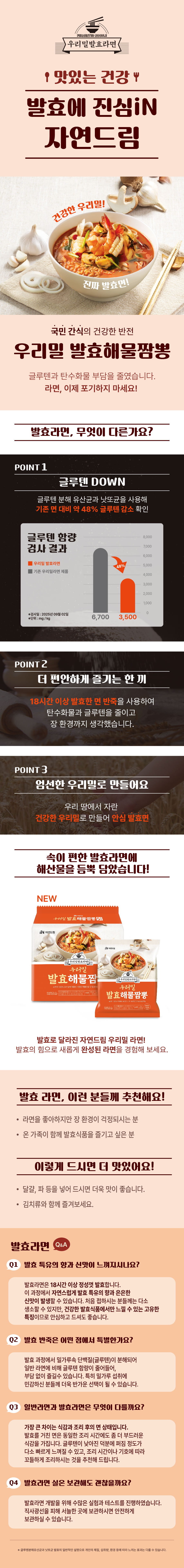 | | | | 물품특징 | | 1. 우리밀로 만든 글루텐을 사용하여 속까지 100% 우리밀입니다. 2. 18시간 이상 발효한 반죽을 사용하였습니다. 3. 중금속 미세플라스틱(45㎛ 기준)불검출 깊은바다소금을 사용했습니다. | | | 이용방법 | | 1. 물 550ml(약 3컵정도)를 끓인 후, 면과 분말스프를 넣고 약 4분30초 끓입니다. 2. 식성에 따라 달걀, 파 등을 넣어 드시면 더욱 맛이 좋습니다. | | | 생산과정 | | 1. 원료 배합 -> 반죽 -> 발효 -> 면대형성 -> 절출 -> 증숙 -> 접안 -> 유탕조에서 튀겨냄 -> 냉각 -> 면 2. 스프를 면과 함께 포장한다. | | | 기타사항 | | * 이 제품은 우유, 복숭아, 토마토, 땅콩, 아황산류, 알류를 사용한 제품과 같은 제조시설에서 제조하고 있습니다. | |