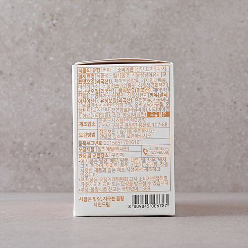 | | | 공급시기 | | 상시공급 | | | 식품유형 | | 커피 | | | 생산지 | | (주)자연드림치유식품 푸드공방 / 전남 구례군 용방면 용산로 107-88 | | | 원부재료 | | 식물성크림1[물엿, 식물성경화유지{코코넛오일(외국산)}, 제이인산칼륨, 카제인나트륨이산화규소], 식물성크림2[물엿,식물성경화유지{코코넛오일(외국산)}, 탈지분유(미국산), 제이인산칼륨], 유함유가공품[물엿, 식물성유지{팜유(말레이시아산)}, 유청분말(외국산), 혼합분유, 가공버터], 동결건조인스턴트커피7%, 올리고당가공품, 혼합제제{덱스트린, 천연향료(바닐라향), 아라비아검}, 향료(카라멜향), 소금, 향료(바닐린), 우유,대두함유 | | | 중량설명 | | 17g*16포 (272g) | | | 포장재질 | | 폴리에틸렌(내면) | | | 소비기한 | | 제조일로부터 18개월 | | | 보관방법 | | 실온보관/ 습기를 주의하시고 건냉한 장소에 보관하십시오. | | | 영양성분표시 | | 총 내용량 272g(17gX16포) / 1봉(17g) 당 함량 열량 80kcal, 나트륨 65mg(3%), 탄수화물 11g(3%), 당류 2g(2%), 지방 3.9g(7%), 트랜스지방 0g, 포화지방 2.8g(19%), 콜레스테롤 0mg, 단백질 1g미만(1%) *() 안의 1일 영양성분 기준치에 대한 비율(%)은 2,000kcal 기준이므로 개인의 필요 열량의 따라 다를 수 있습니다. | |
