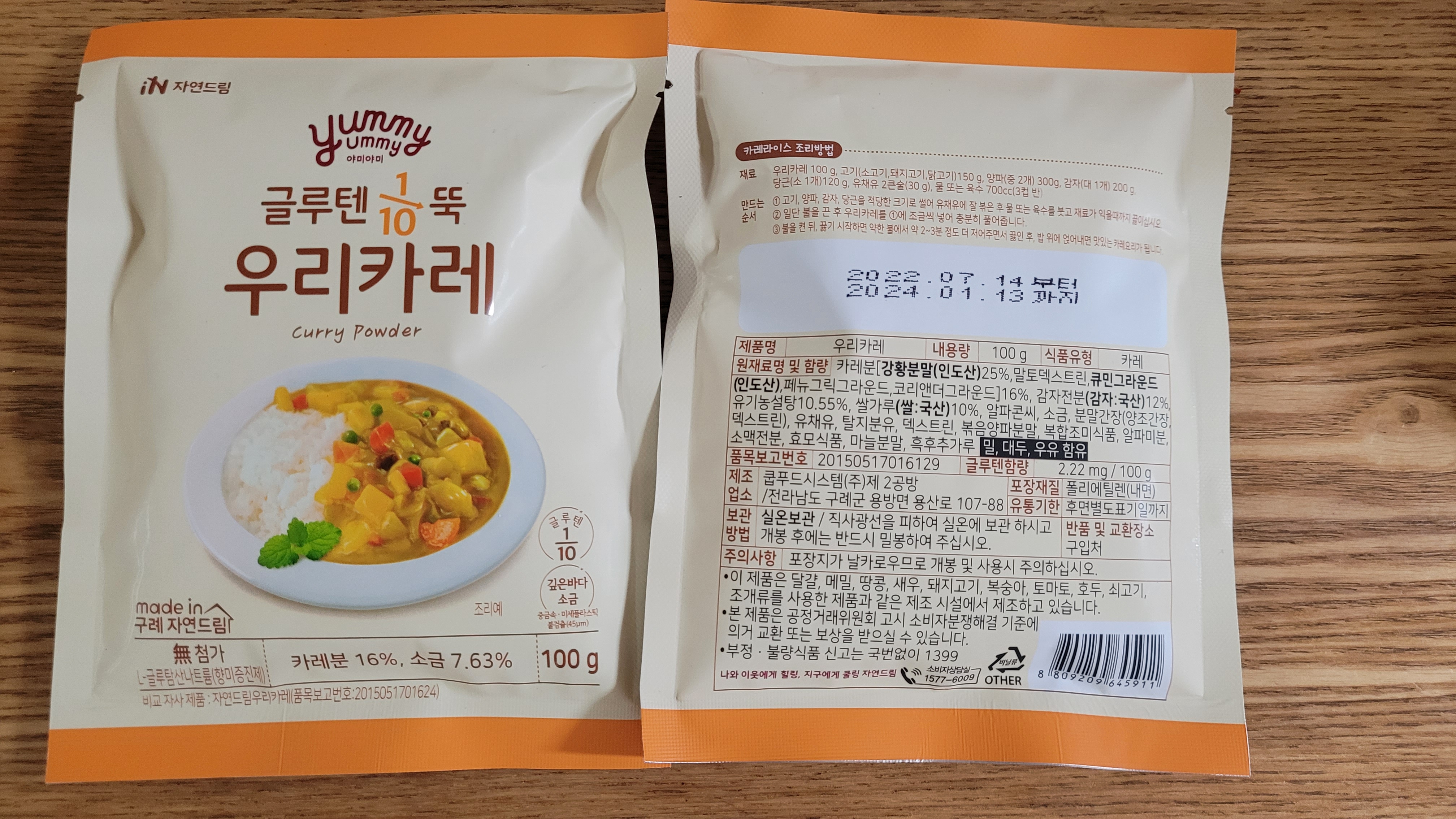 원부재료카레분[강황분말(인도산) 25%, 말토덱스트린, 큐민그라운드(인도산), 페뉴그릭그라운드, 코리앤더그라운드] 16%, 감자전분(감자:국산) 12%, 유기농설탕 10.55%, 쌀가루(쌀:국산) 10%, 알파콘씨, 소금, 분말간장(양조간장, 덱스트린), 유채유, 탈지분유, 덱스트린, 볶은양파분말, 복합조미식품, 일파미분, 소맥전분, 효모식품, 마늘분말, 흑후추가루