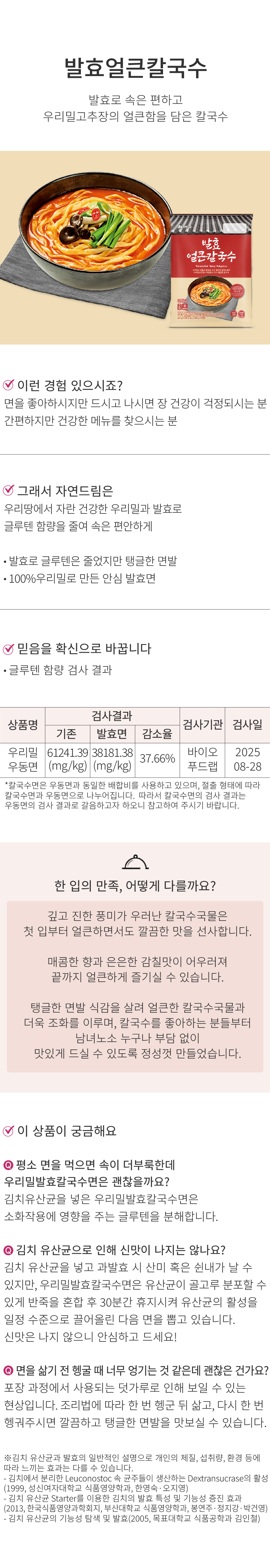 | | | 물품특징 | | 1. 괴산자연드림파크 내 면공방에서 직접 생산하여 공급합니다. 2. 깊은바다소금으로 면을 반죽하여 탱글한 칼국수면입니다. | | | 이용방법 | | 1. 냄비에 물 500-550ml와 액상소스를 넣고 강불에서 끓여줍니다.(기호에 따라 야채를 추가해 주세요.) 2. 끓기 시작하면 자연해동된 면을 흐르는 물에 헹구어 전분을 제거한 후 육수에 넣고 중불에서 7-8분간 끓여줍니다. | | | 생산과정 | | 원료투입→혼합→반죽→숙성→제면→내포장→외포장→금속검출기통과→보관 및 출고 | | | 기타사항 | | *이 제품은 메밀, 토마토, 조개류, 돼지고기, 우유, 새우, 알류, 닭고기, 고등어, 땅콩, 오징어, 게, 아황산류, 복숭아, 호두, 잣을 사용한 제품과 같은 제조시설에서 제조하고 있습니다. *이미 냉동된 바 있으니 해동 후 재냉동시키지 마시기 바랍니다. *제품 개봉 후 나는 알코올냄새는 식용주정냄새입니다. 인체에 무해하며, 끓는 물에 증발하나 일부 극소량 남아 있을 수 있으니 알코올 냄새와 섭취에 예민하신 분은 주의하셔야 합니다. *포장이 파손되지 않도록 보관에 유의해 주시고, 개봉 후에는 즉시 조리해 드십시오. *조리 시 뜨거운 물에 데이지 않도록 조심하십시오. | |