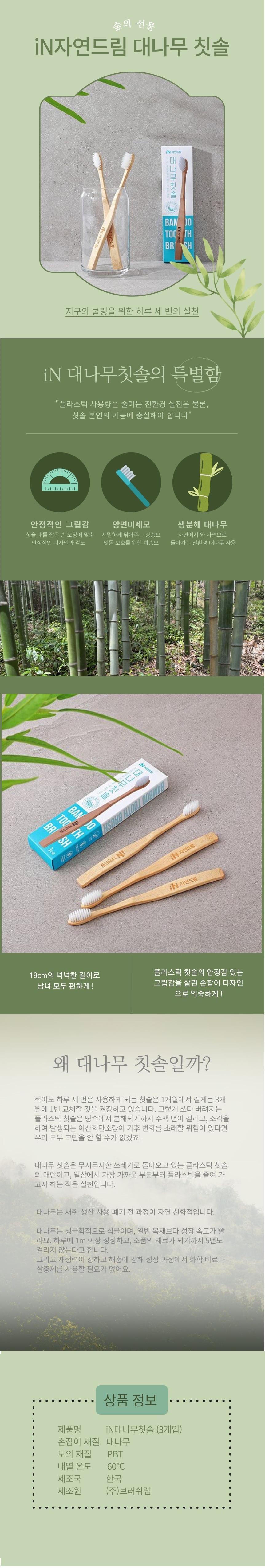 | 품명 및 모델명 | iN대나무칫솔(3개입) | | 법에 의한 인증·허가 등을 받았음을 확인할 수 있는 경우 그에 대한 사항 | 해당사항 없음 | | 제조국 또는 원산지 | 한국 | | 제조자, 수입품의 경우 수입자를 함께 표기 | 브러쉬랩(주) | | A/S 책임자와 전화번호 또는 소비자상담 관련 전화번호 | 상담팀 1577-6009 |