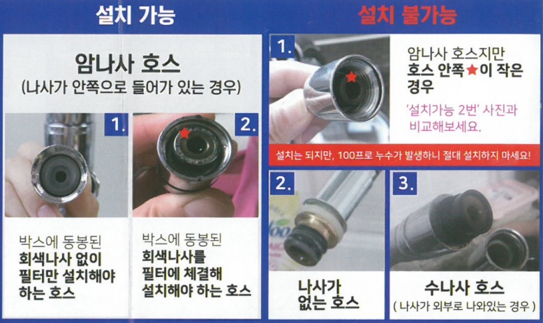 ■ 사용 상의 주의사항 1) 설치/교체 과정에서 과다한 충격을 받으면 파손에 위험이 있으니 주위바랍니다. ※설치 가능 수전 참고