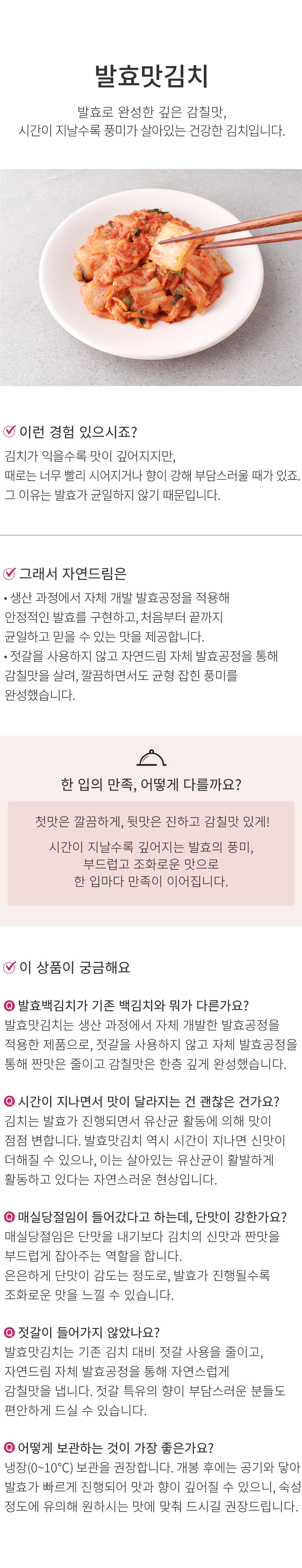 발효절임배추[배추(국산), 소금(국산), 찹쌀풀{정제수,찹쌀가루(찹쌀:국산)}, 유산균], 정제수, 무(국산), 양파(국산), 쪽파(국산), 마늘(국산), 고춧가루(국산), 다시마육수(다시마:국산), 매실당절임[매실(국산)50%,설탕], 갓(국산), 찹쌀풀[정제수,찹쌀가루(찹쌀/국산)15%], 소금(국산), 생강(국산), 효모식품