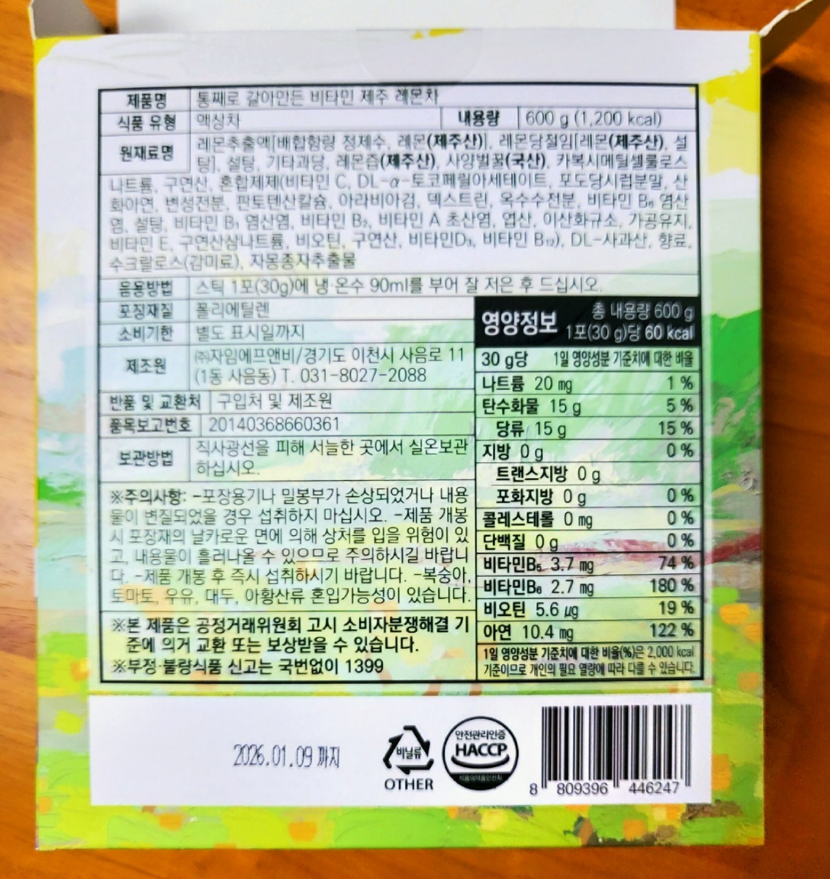 원부재료레몬추출액[배합함량 정제수, 레몬(제주산)], 레몬당절임[레몬(제주산), 설탕], 설탕, 기타과당, 레몬즙(제주산), 사양벌꿀(국산), 카보시메틸셀룰로스나트륨, 구연산, 혼합제제(비타민 C, DL-a-토코페릴아세테이트, 포도당시럽분말, 산화아연, 변성전분, 판토텐산칼슘, 아라비아검, 덱스트린, 옥수수전분, 비타민B6 염산염, 설탕, 비타민B1 염산염, 비타민B2, 비타민A 초산염, 엽산, 이산화규소, 가공유지, 비타민E, 구연산삼나트륨, 비오틴, 구연산, 비타민D3, 비타민B12), DL-사과산, 향료, 수크랄로스(감미료), 자몽종자추출물