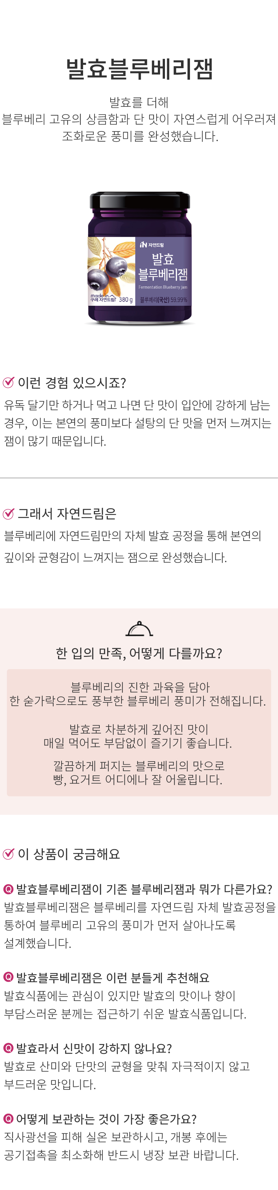 | | | 물품특징 | | 1.구례자연드림파크 과채가공센터에서 생산합니다. 2. 국산 블루베리와 유기농설탕으로 만든 발효잼입니다. 3. 합성향료 를 넣지 않았습니다. | | | 이용방법 | | 빵에 발라 이용하시거나, 요거트 등에 타서 드셔도 좋습니다. | | | 생산과정 | | 원재료입고->선별 및 세척->계량->분쇄->살균->냉각 및 발효->실활 및 혼합->농축->충진 및 살균->보관 및 출하 | | | 기타사항 | | 1. 본 상품은 첨가물이 최대한 배제되어 있으므로, 개봉 후 반드시 냉장보관 바랍니다.