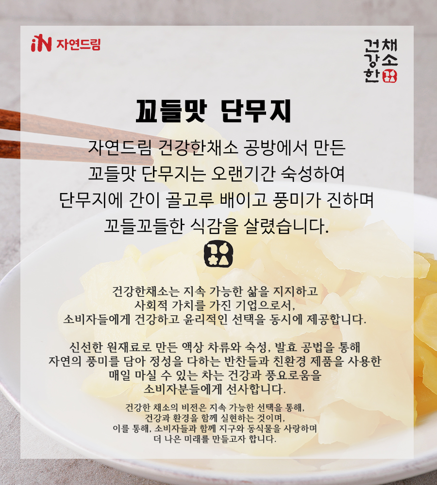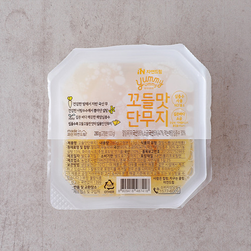 | | | 공급시기 | | 상시공급 | | | 식품유형 | | 절임식품(살균제품) | | | 생산지 | | 1. 생산지명 : ㈜건강한채소 2. 주소 : 충북 괴산군 괴산읍 자연식품1길25 | | | 원부재료 | | 절임무[무농약무(국산)95%, 소금]47%, 정제수, 유기농설탕 13%, 발효식초[주정, 포도당, 엿기름(국산)]10% | | | 중량설명 | | 280g(고형분 123g) | | | 포장재질 | | 폴리프로필렌(내면) | | | 소비기한 | | 제조일로부터 4개월 | | | 보관방법 | | 냉장보관 | | | 영양성분표시 | | | |