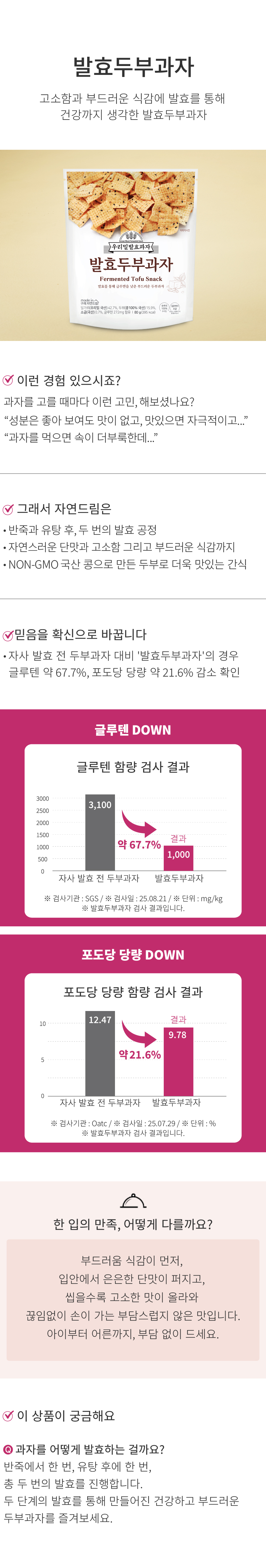 | | | 상품특징 | | 고소함과 부드러운 식감에 발효를 통해 건강까지 생각한 발효두부과자입니다. | | | 생산과정 | | 원료입고 → 선별 → 계량 → 배합 → 반죽 → 발효 → 성형 → 가열(유탕) → 건조 → 종균 도포 → 포장 → 금속검출 → 출고 | | | 이용방법 | | 담백하고 고소하여 어른, 아이들 모두 즐길 수 있는 간식입니다. | | | 기타사항 | | 이 제품은 소고기, 돼지고기, 닭고기, 새우, 게, 오징어, 고등어, 조개류, 땅콩, 호두, 잣, 복숭아, 토마토, 메밀, 아황산류를 사용한 제품과 같은 시설에서 제조하고 있습니다.