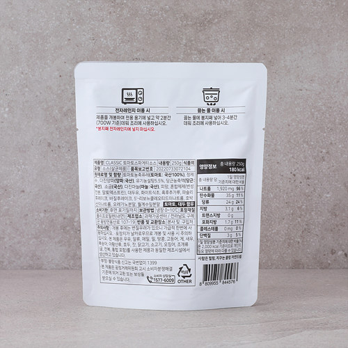 [조리방법] 1. 밑이 둥글고 깊은 후라이팬에 면이 충분히 담길만큼 물을 준비하여 끓인후 스파게티면이 투명하게 보일정도로 삶아서 물기를 뺍니다. 2. 올리브유 또는 식용유를 두른 다음 1번의 면을 넣고 살짝 볶습니다. 3. 2번의 면에 스파게티소스를 넣고 다시 2~3분간 볶으면 맛있는 스파게티가 완성됩니다. *기호에 따라 볶은고기, 해산물, 양송이, 모짜렐라치즈 등을 넣어 드셔도 좋습니다. *오븐스파게티소스, 리조또, 피자소스로 사용하셔도 좋습니다. | | | 생산과정 | | 원재료입고->계량->원재료투입->혼합->점검->내포장(충진)-> X-ray검출기->살균->외포장->보관 및 출하 | | | 기타사항 | | 1. 본 상품은 첨가물이 최대한 배제되어 있으므로, 개봉 후 가급적 빠른 기간내에 드시기 바랍니다.