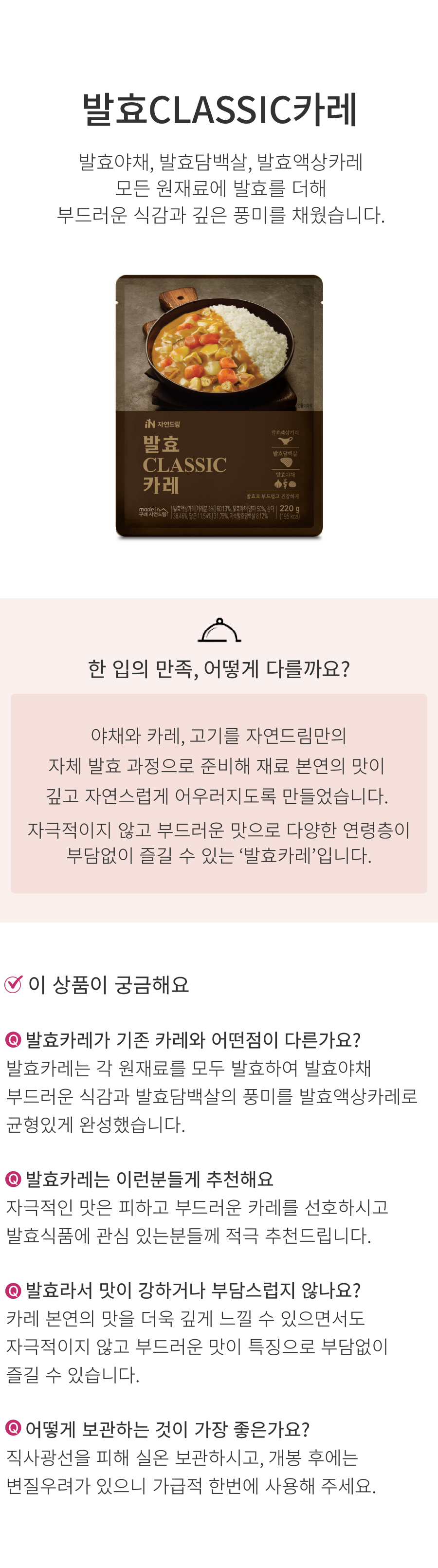 | | | 물품특징 | | 1.구례자연드림파크 과채가공센터에서 생산합니다. 2. 자연드림 돼지고기와 국산 채소로 발효하여 만든 즉석카레입니다. 3. 합성향료를 넣지 않았습니다. | | | 이용방법 | | 1. 전자레인지 이용시에는 절취부분을 자른 후 봉지 그대로 세워서 약 2~3분간 기호에 맞게 데워서 드십시오.