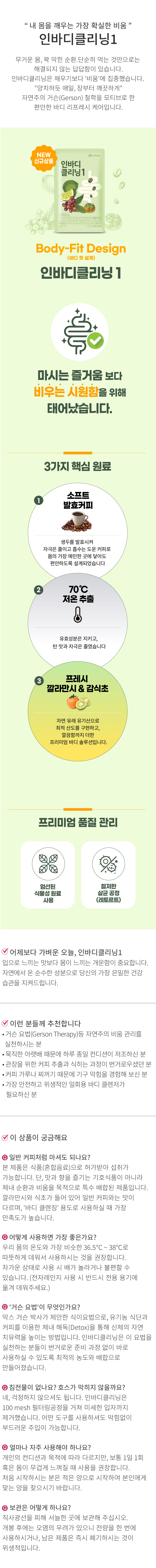 | | | 물품특징 | | *콜롬비아산 생두를 발효시켜 저온추출공법으로 추출하였습니다. *유기산이 풍부한 깔라만시와 감식초를 한팩에 담았습니다. *거슨요법에 사용되는 제품이니 확인하고 구매하시기 바랍니다. | | | 이용방법 | | 인바디클리닝1의 5포(500ml)에 , 뜨거운물 500ml를 섞어가면서 40도 이하의 미지근한 온도로 맞춰 사용하세요. *주의:너무 높은 온도로 사용시 화상 위험이 있으니 주의하세요. | | | 생산과정 | | 원재료 투입 → 추출 →교반-> 여과(100mesh) → 살균 → 포장→ 출고 | | | 기타사항 | | *너무 높은 온도로 사용시 화상 위험이 있으니 주의 하세요. *특정질환과 특이 체질, 알레르기 체질의 경우 과민반응을 나타낼 수 있으므로 원료 성분을 확인하세요. *간혹 소량의 원두 잔여물(고형분)이 보일 수 있습니다. 이는 원료에서 유래한 커피 미립자가 장시간 가라앉아 뭉쳐진 현상이므로, 사용 전에 잘 흔들어 주세요. *전자레인지에 봉지째 데우지 마세요. | |