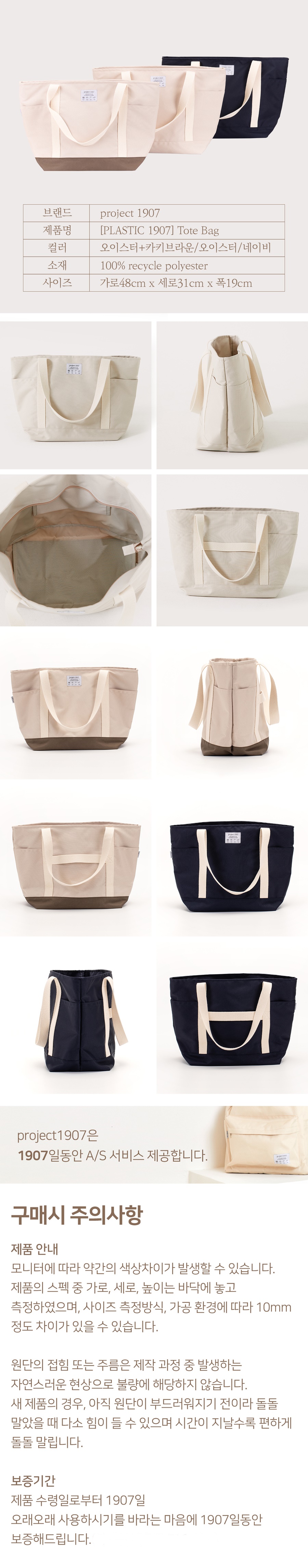 | 종류 | Tote Bag | | 소재 | 100% recycle polyester | | 색상 | 오이스터, 네이비, 오이스터+브라운 | | 크기 | 48*31*19cm / 380g | | 제조자, 수입품의 경우 수입자를 함께 표기 (병행수입의 경우 병행수입 여부로 대체 가능) | 위드어스 | | 제조국 | 대한민국 | | 취급시 주의사항 | 상세정보 참고 | | 품질보증기준 | 관련 법 및 소비자분쟁해결 기준에 따름 | | A/S 책임자와 전화번호 | 상담팀 1577-6009 |