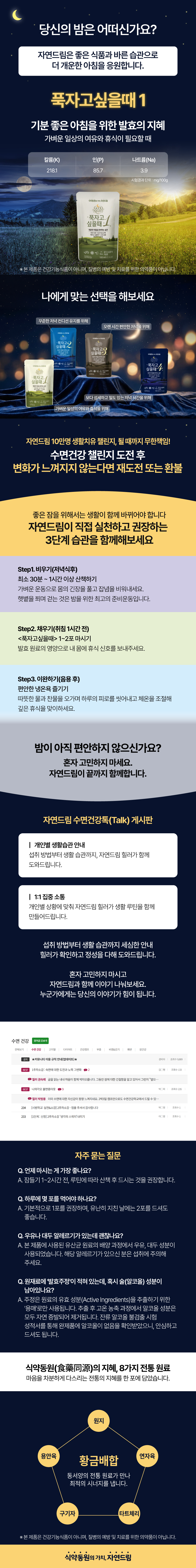 | | | 물품특징 | | . 시금치, 깻잎, 녹차, 미강을 발효하여 자연 유래 원료의 가치를 담았습니다. . 용안육·원지·연자육·구기자에 타트체리를 더해 동서양 전통 원료가 조화를 이루는 프리미엄 블렌딩 음료입니다. . 정성껏 추출한 원액을 한 번 더 농축해 깊고 진한 풍미를 완성했습니다. . 마그네슘강화 기픈물을 사용하여 풍부한 미네랄까지 담았습니다. . 바쁜 일상 속 편안한 휴식을 위한 한 잔을 제안합니다. | | | 이용방법 | | . 하루 섭취량 1~2개를 권장합니다. . 취침 1~2시간전에 섭취하는 것을 권장합니다. . 가벼운 산책과 냉온욕 후 섭취하시면 더 좋습니다. . 운전 전에는 섭취를 주의해 주세요 . 생약성분을 함유하고 있으므로 임산부 및 영·유아는 전문의와 상의 후 섭취해 주세요.