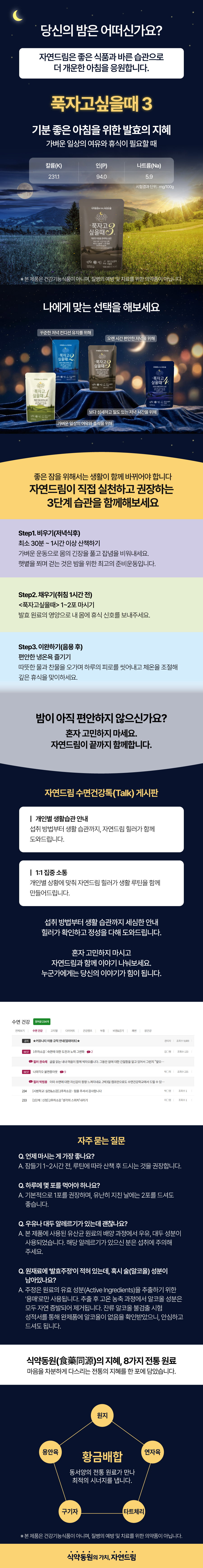 | | | 물품특징 | | . 시금치, 깻잎, 녹차, 미강을 발효하여 자연 유래 원료의 가치를 담았습니다. . 용안육·원지·연자육·구기자에 타트체리를 더해 동서양 전통 원료가 조화를 이루는 프리미엄 블렌딩 음료입니다. . 정성껏 추출한 원액을 한 번 더 농축해 깊고 진한 풍미를 완성했습니다. . 마그네슘강화 기픈물을 사용하여 풍부한 미네랄까지 담았습니다. . 바쁜 일상 속 편안한 휴식을 위한 한 잔을 제안합니다. | | | 이용방법 | | . 하루 섭취량 1~2개를 권장합니다. . 취침 1~2시간전에 섭취하는 것을 권장합니다. . 가벼운 산책과 냉온욕 후 섭취하시면 더 좋습니다. . 운전 전에는 섭취를 주의해 주세요 . 생약성분을 함유하고 있으므로 임산부 및 영·유아는 전문의와 상의 후 섭취해 주세요.