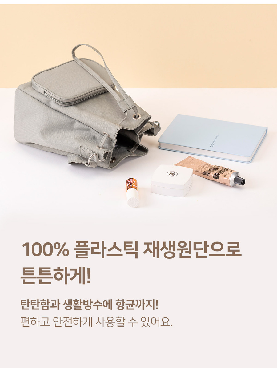 | | | 물품특징 | | ① 페트병 13개를 재활용하여 제작되었으며, 페트병을 100% 리사이클한 플라텍스로 제작되었습니다. ② 원단 제직부터 봉제까지 국내에서 전부 이루어져 탄소 배출을 절감하였습니다. ③ 미니멀한 사이즈로 제작되어 가볍게 휴대가 가능합니다. ④ 플라텍스 원단으로 제작되어 내구성이 탁월하며, 생활방수 기능을 가져 외부 활동에 적합합니다. ⑤ 크로스백으로 착용 가능한 스트랩이 별도 포함되어있어 핸드백으로도, 크로스백으로도 착용이 가능합니다. ⑥ 전면 포켓을 활용하여 필요한 휴대품들을 간편하게 수납이 가능합니다. | | | 이용방법 | | ① 부분 물세탁 (부분적으로 오염이 되었을 때, 온수에 세제를 푸신 후 손으로 가볍게 문질러 주세요. 바람이 잘 통하는 곳에서 햇볕에 충분히 말려주세요.) ② 건조 시에는 자연건조를 추천합니다. 건조기 사용 시 제품 손상 및 변형의 우려가 있습니다. | | | 생산과정 | | ① 국내 페트병 수거 (MOU 업체에서 제공)② 페트병을 플레이크로 잘게 분쇄③ 페트병 플레이크를 활용하여 원사 제작④ 원사를 활용해 원단 제직⑤ 제품 디자인 이후 국내 봉제 공장에서 제품 제작 | | | 반품정보 | | ※ 본 제품은 산지 직배송 상품입니다. 반품 시 상담팀 접수 후 생산지로 택배 발송해 주시기 바랍니다. (교환을 원하실 경우, 반품 후 재 구매해 주시기 바랍니다.)