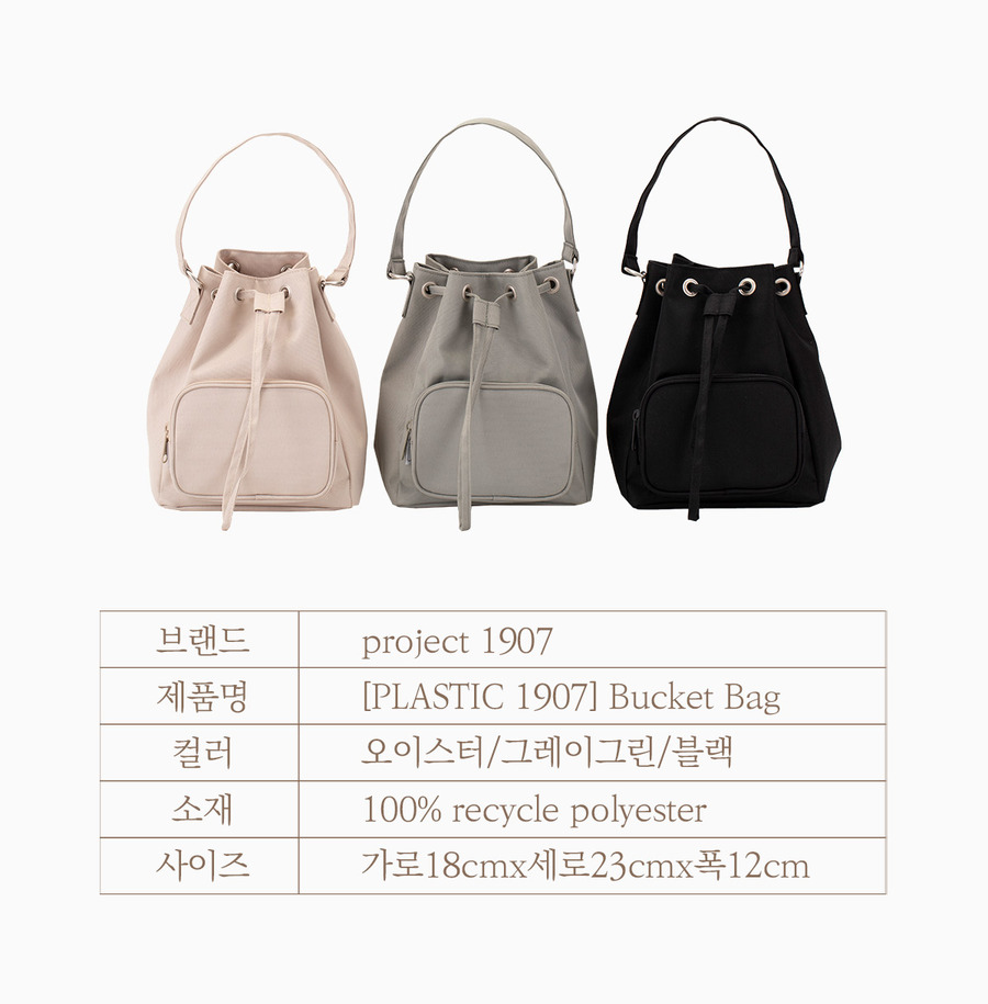 | 종류 | Bucket Bag | | 소재 | 100% recycle polyester | | 색상 | 오이스터, 그레이그린, 블랙 | | 크기 | 18*23*12cm / 260g | | 제조자, 수입품의 경우 수입자를 함께 표기 (병행수입의 경우 병행수입 여부로 대체 가능) | 위드어스 | | 제조국 | 대한민국 | | 취급시 주의사항 | 상세정보 참고 | | 품질보증기준 | 관련 법 및 소비자분쟁해결 기준에 따름 | | A/S 책임자와 전화번호 | 상담팀 1577-6009 |