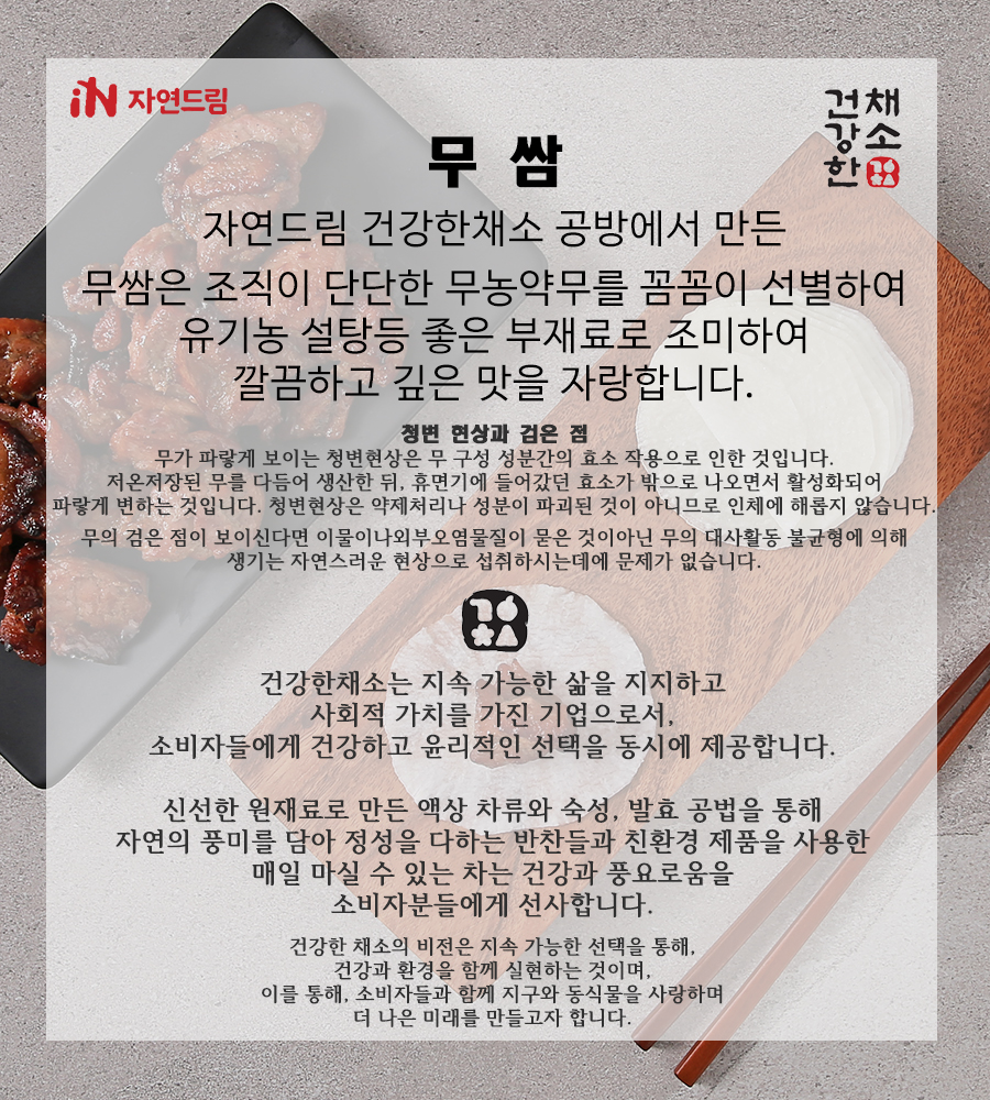 | | | 물품특징 | | 1. 국내산 무농약 무를 사용하였습니다. 2. 깊은바다소금을 사용하였습니다. 3. 사카린나트륨, 빙초산, 보존료, L-글루탐산나트륨 無첨가 | | | 이용방법 | | 1. 쌈용 또는 샐러드와 함께 드십시오. | | | 생산과정 | | 원재료 입고 - 전처리 - 세척 - 탈피 - 세절 - 계량 - 조미액 충진 - 포장 - 살균 - 보관 - 출하 | | | 기타사항 | | 칼 등으로 포장지를 제거할 경우 손을 다치지 않게 조심하세요. | |