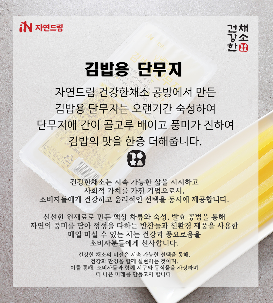 | | | 물품특징 | | 1. 국내산 무농약 무를 사용하였습니다. 2. 사카린나트륨, 빙초산, 보존료, L-글루탐산나트륨 無첨가 | | | 이용방법 | | 1. 김밥의 재료 또는 반찬용으로 드셔도 좋습니다. | | | 생산과정 | | 원재료 입고 - 전처리 - 세척 - 염절임 - 탈염 - 계량 - 조미액 충진 - 포장 - 살균 - 보관 - 출하 | | | 기타사항 | | 칼 등으로 포장지를 제거할 경우 손을 다치지 않게 조심하세요. | |