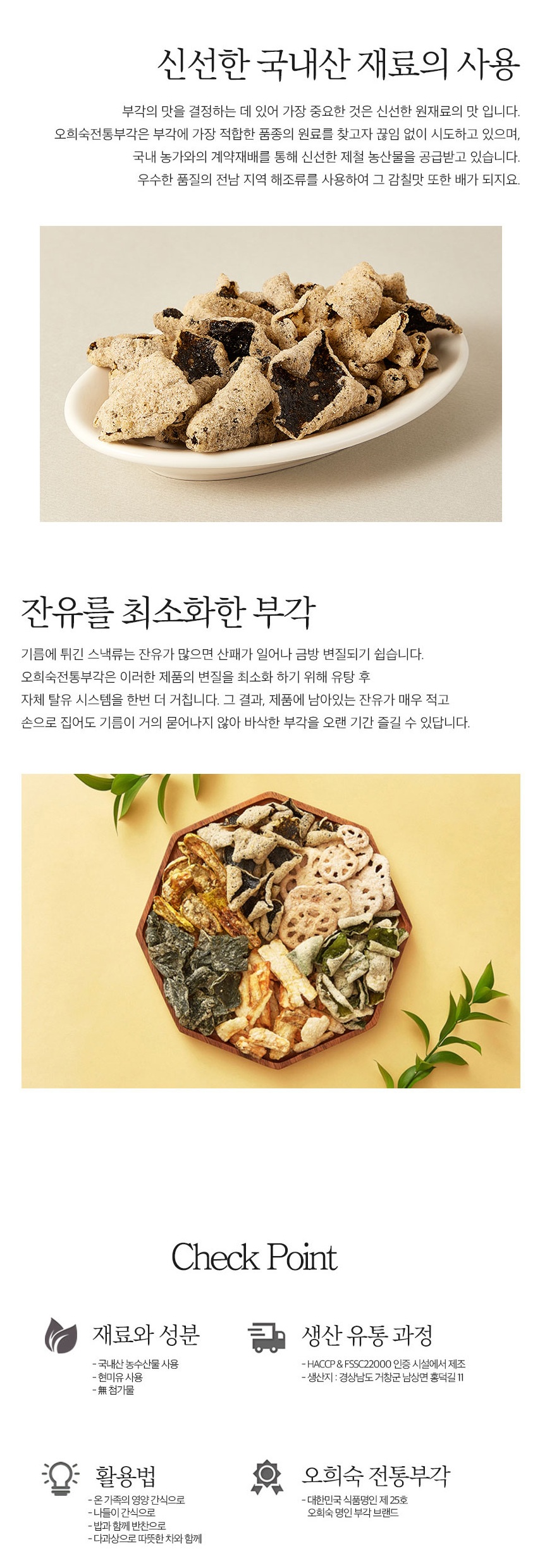| | | 물품특징 | | 온 가족이 즐길 수 있도록 만들었습니다. | | | 생산과정 | | 원재료 투입 - 건조 - 유탕 - 포장 | | | 이용방법 | | 간식 또는 반찬용 | | | 기타사항 | | 개봉 후에는 빠른 시간 내에 드시는 것이 좋습니다. | |
