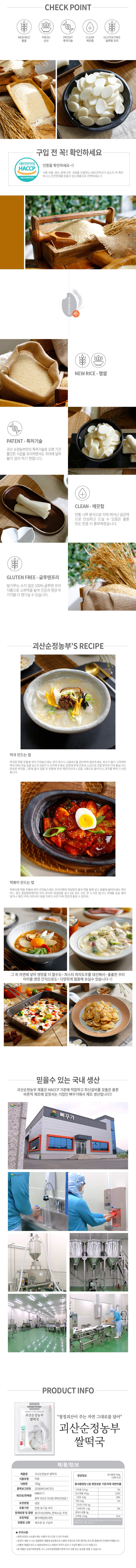 | | | 물품특징 | | 국내산 쌀을 사용했습니다. 쫄깃한 식감과 고소한 맛이 특징입니다. | | | 생산과정 | | 원료투입-자동세척-분쇄증숙기-저온숙성-포장라인-금속탐지기 | | | 이용방법 | | 떡국이나 떡볶이를 만들어 드시면 좋습니다. | | | 기타사항 | | 함께 포장된 산소흡수제는 식용이 아니므로 드시지 마세요. 포장지 개봉 시 나는 알콜향은 제품에 살균용으로 사용한 주정이며, 조리중 증발됩니다. 개보한 제품은 반드시 냉장보관하시고, 변질의 우려가 있으니 가급적 빠르게 드시기 바랍니다. | |