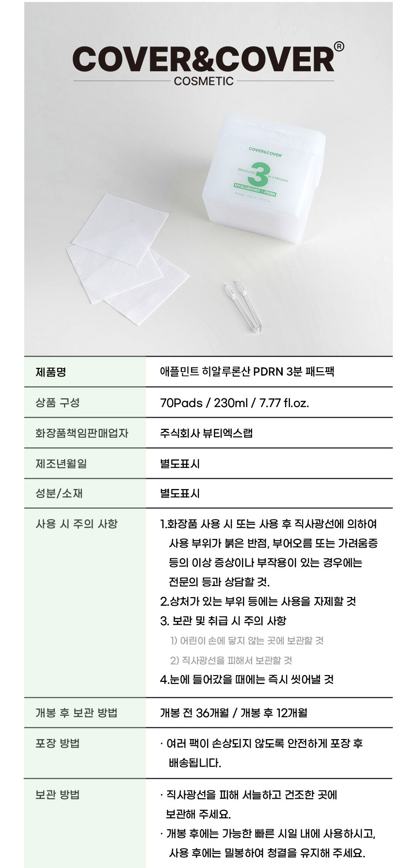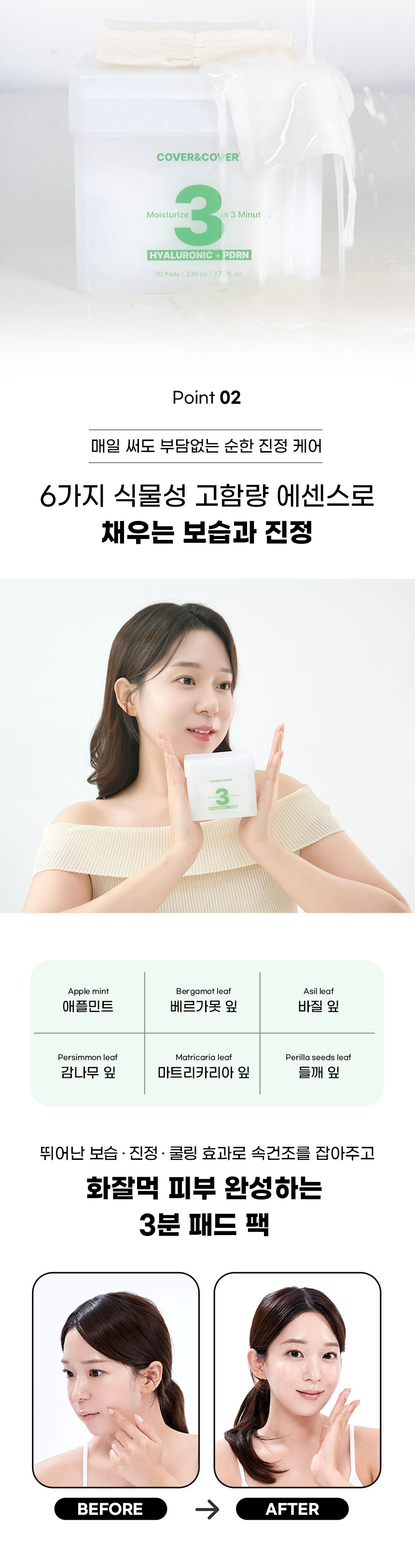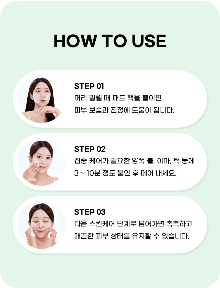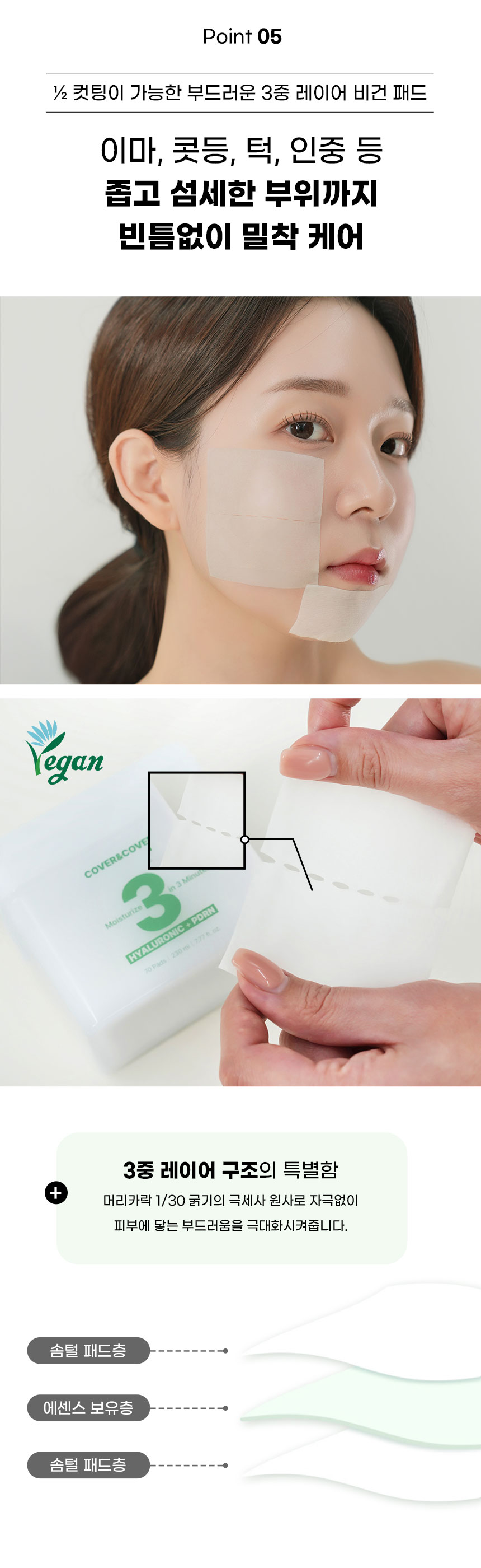 | | | 물품특징 | | 반으로 컷팅하여 사용이 가능하도록 만들었습니다. 3중(솜털 패드층 / 에센스 보유층 / 솜펄패드충) 엠보싱 비건패드 사용 고보습 3분 패드팩 | | | 이용방법 | | 집중 케어가 필요한 볼, 이마, 턱 등에 3~10분 정도 붙인 후 떼어 내세요 | | | 이용 팁 | | 머리 말릴 때 패드 팩을 붙이면 피부 보습과 진정에 도움이 됩니다. | |