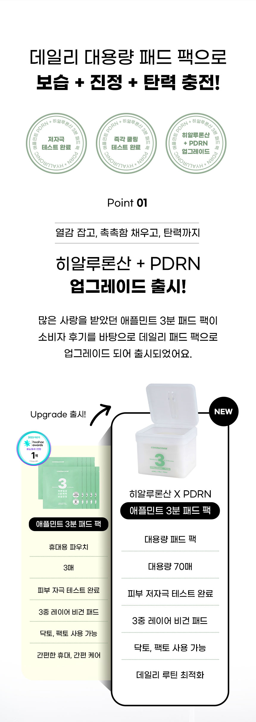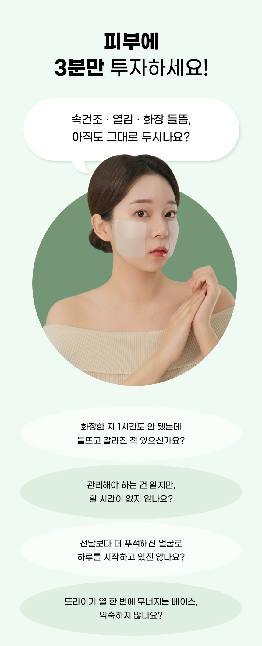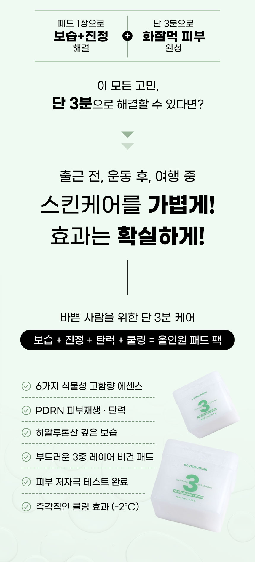 | | | 물품특징 | | 반으로 컷팅하여 사용이 가능하도록 만들었습니다. 3중(솜털 패드층 / 에센스 보유층 / 솜펄패드충) 엠보싱 비건패드 사용 고보습 3분 패드팩 | | | 이용방법 | | 집중 케어가 필요한 볼, 이마, 턱 등에 3~10분 정도 붙인 후 떼어 내세요 | | | 이용 팁 | | 머리 말릴 때 패드 팩을 붙이면 피부 보습과 진정에 도움이 됩니다. | |