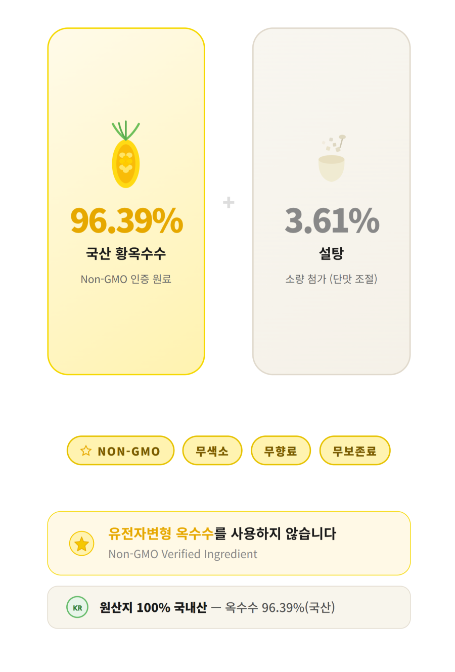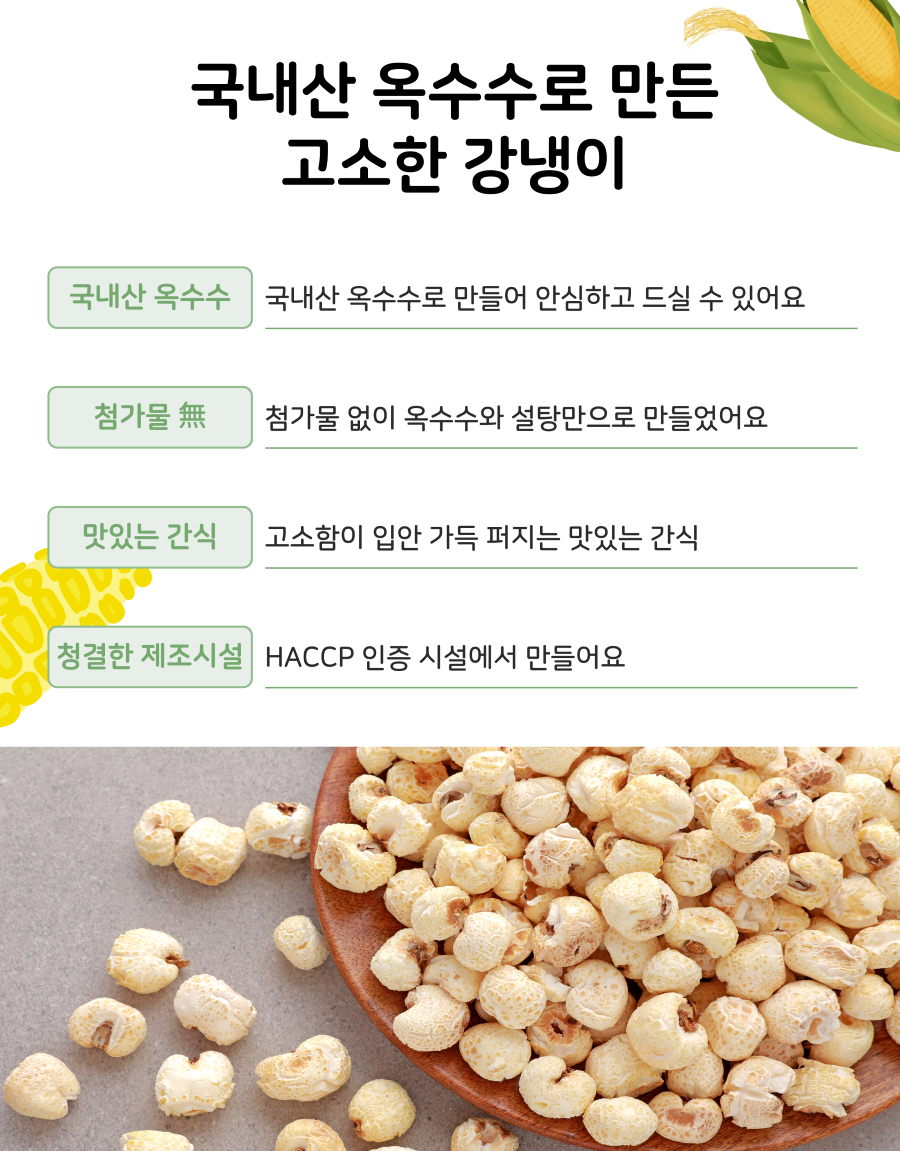 | | | 물품특징 | | 첨가물 없이, 국산 옥수수와 설탕으로 만들었습니다. 고소하고 맛있는 강냉이입니다. 눅눅해졌을 때는 전자레인지용 용기에 담아 10초간 돌리면 다시 바삭해집니다. | | | 생산과정 | | 원재료 투입 - 가열 - 포장 | | | 이용방법 | | 간식용으로 이용 | | | 기타사항 | | 본 제품을 밀을 사용한 제품과 같은 제조시설에서 제조하고 있습니다. | |