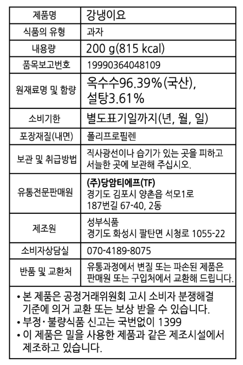 | | | 공급시기 | | 기획공급 | | | 식품유형 | | 과자 | | | 생산지 | | 유통전문판매원: (주)당암티에프 / 경기도 김포시 양촌읍 석모1로 187번길 67-40, 2동 제조원: 성부식품 / 경기도 화성시 팔탄면 시청로 1055-22 | | | 원부재료 | | 옥수수 96.39%(국내산), 설탕 3.61% | | | 중량설명 | | 200g | | | 포장재질 | | 폴리프로필렌(내면) | | | 소비기한 | | 제조일로부터 1년까지 | | | 보관방법 | | 실온보관 (직사광선이나 습기가 있는 곳을 피하고 서늘한 곳에 보관) | | | 영양성분표시 | | 총 내용량 200g [100g 당 405 kcal] 100g 당(1일 영양성분 기준치에 대한 비율) 나트륨 55mg(3%), 탄수화물 86g(27%), 당류 16g(16%), 지방 3.1g(6%), 트랜스지방 0g, 포화지방 0.5g(3%), 콜레스테롤 0mg(0%), 단백질 9g(16%) *1일 영양성분 기준치에 대한 비율(%)은 2,000 kcal 기준임로 개인의 필요 열량에 따라 다를 수 있습니다. | |