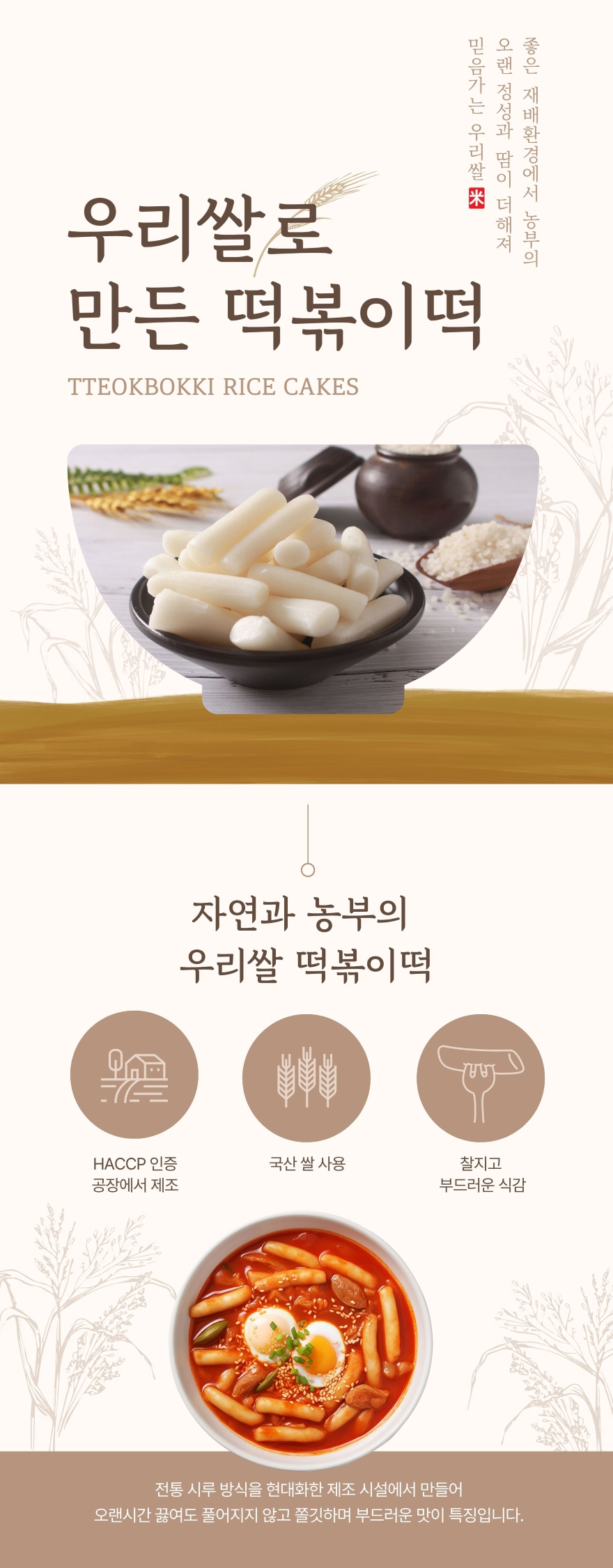 | | | 물품특징 | | 국산 쌀을 사용하며 쫄깃한 식감의 쌀 떡볶이떡입니다. | | | 생산과정 | | 원료 투입 - 가열 - 성형 - 포장 | | | 이용방법 | | 1. 떡을 흐르는 물에 헹굽니다. 2. 떡볶이떡과 물, 떡볶이 소스를 넣어 중불로 3분간 조리합니다. * 떡 조리시간에 따라 식감이 다를 수 있습니다. | | | 기타사항 | | 함께 포장된 산소흡수제는 식용이 아니므로 드시지 마십시오. 포장재 개봉시 나는 알콜향은 제품에 사용한 주정으로 인한 향이며, 조리중 증발되어 인체에 무해 합니다. 개봉한 제품은 변질 우려가 있으니, 반드시 냉장고에 보관하시기 바랍니다. 떡의 검은 점은 쌀겨의 일부분으로 취식에 이상이 없으니 안심하고 드시기 바랍니다. | |