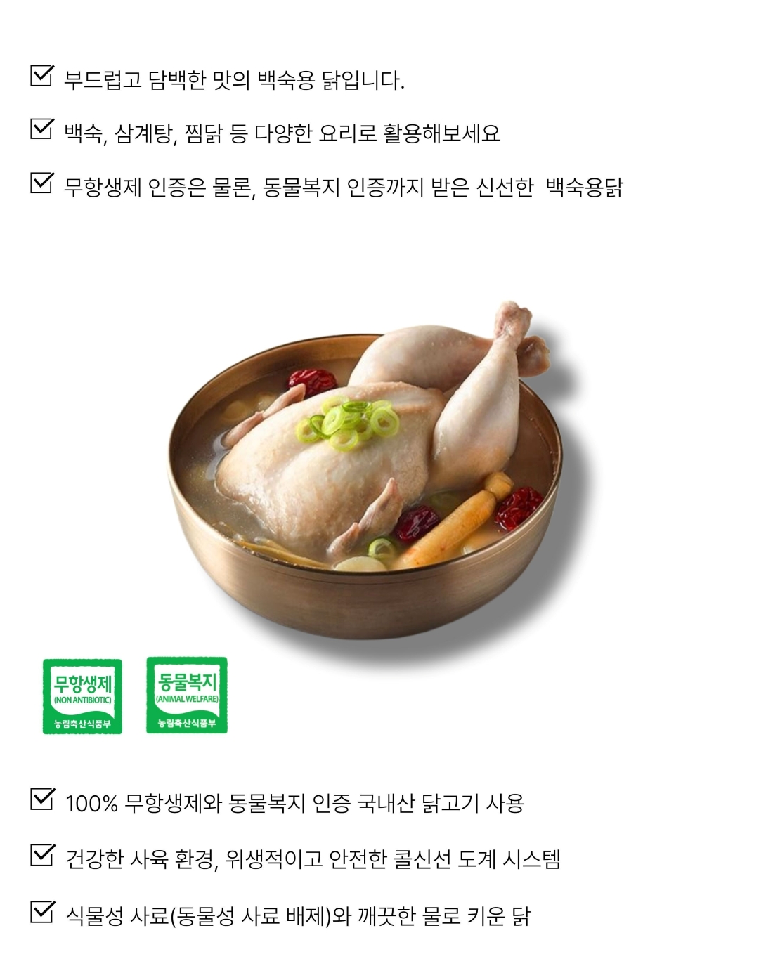| | | 물품특징 | | 무항생제 동물복지 인증 닭고기를 사용합니다 |