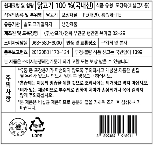 | | | 공급시기 | | 기획공급 | | | 제조원 및 도축장명 | | (주)참프레 / 전북 부안군 행안면 옥여길 32-29 | | | | 중량설명 | | 1kg | | | 원재료명 및 함량 | | 무항생제 동물복지 인증 닭고기 100%(국내산) | | | 포장재질 | | PE(내면), PE(흡습제) | | | 소비기한 | | 제조일로부터 9일까지 | | | 보관방법 | | -2~5도 냉장보관 | |