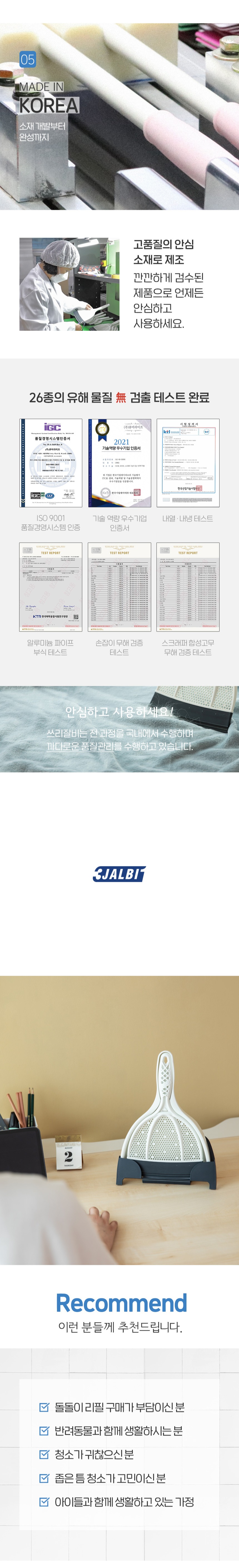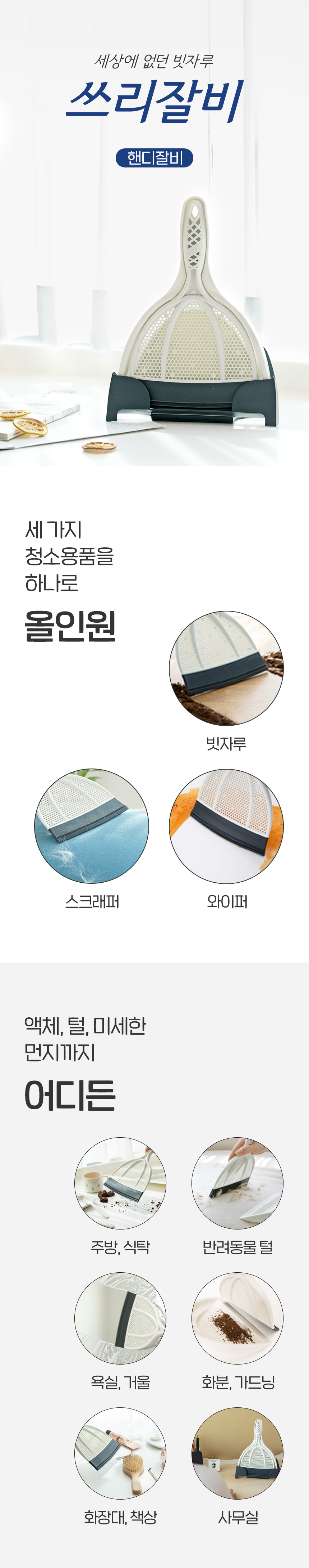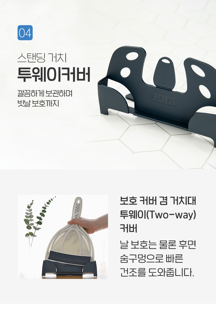 | | | 공급시기 | | 기획공급 | | | 생산지 | | (주)큐어라이프 | | | 재질 | | PP, 엘라스토머(TPE), 알루미늄 | | | 규격 | | 180mm x 280mm | | | 구성 | | 핸디잘비 본체, 핸디받기, 투웨이커버 | | | 소비기한 | | 해당없음 | | | 주의사 | | 1. 빗자루를 바닥에 세워 보관하면 헤드의 날이 휘어질 수 있으니 동봉된 행거에 걸어서 보관하세요 2. 내구성 유지를 위해 직사광선 아래 또는 열원 근처에는 보관하지 말아주세요 3. 흠집이 나기 쉬운 재질을 쓸어낼 때는 반드시 모래나 흙 등의 이물질을 제거한 후 사용 4. 본 제품은 실내용 제품으로 야외에서 사용 시 제품이 손상될 수 있습니다. 5. 본래 용도 외 다른 용도로 사용하지 마십시오 | |