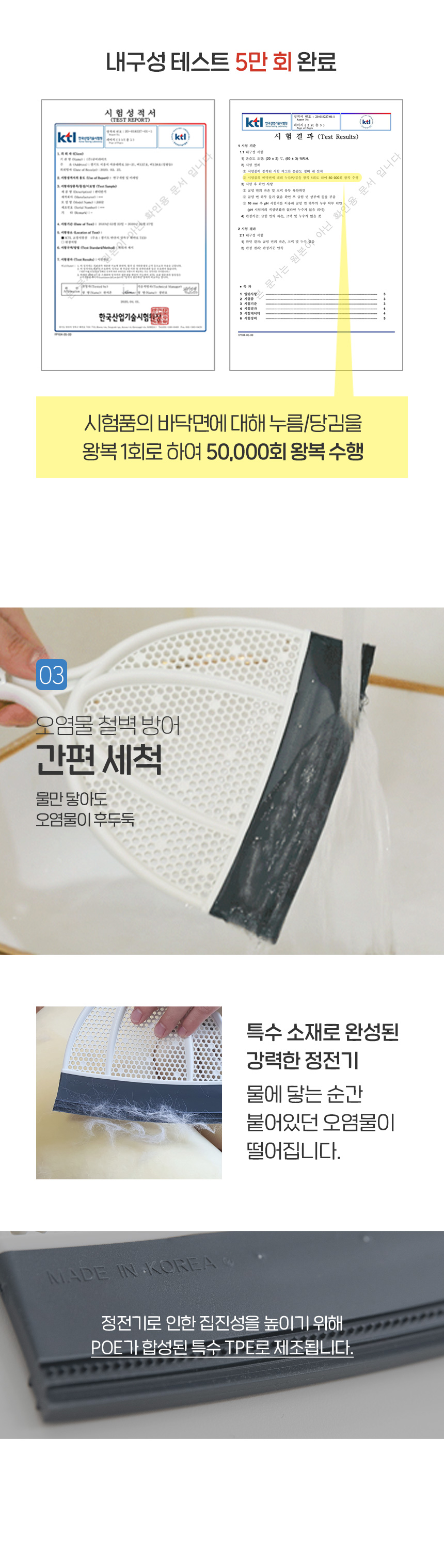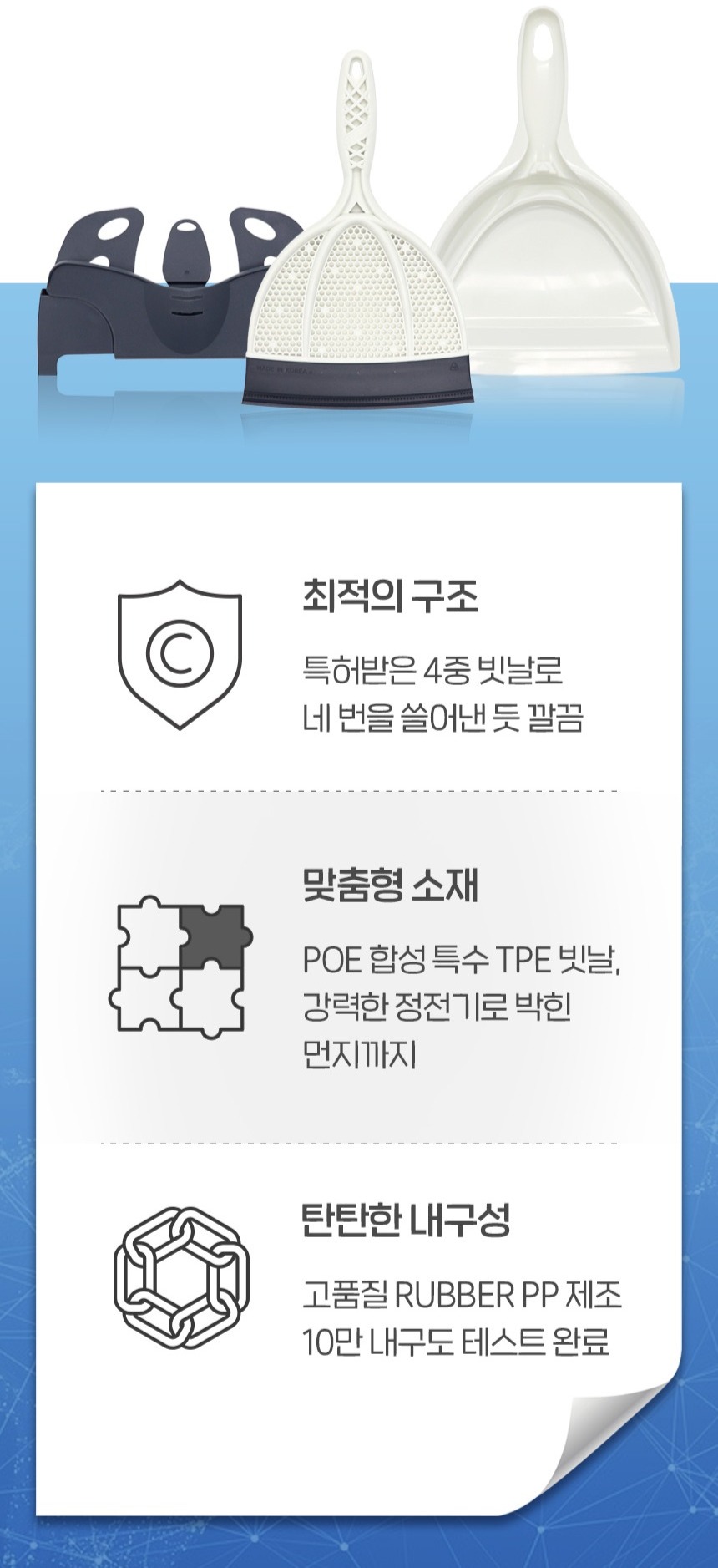 | | | 물품특징 | | 특허받은 4중 빗날을 사용합니다. 손에 힘을 들이지 않아도 더욱 깔끔하고 깨끗한 청소가 가능합니다. 가벼운 무게로 (120g) 손목의 피로도를 최소화했습니다. | | | 이용방법 | | 먼지 부분, 화장실 물 제거 시 사용 | | | 기타 | | 1. 박스 개봉 뒤 제품 불량 사유가 아닌 단순 변심으로 인한 교환 및 반품 불가 2. 핸디받기 뒤쪽의 접힘 부는 수축이 불가능한 재질 특성상 후면의 경우 우는 듯한 이미지가 보이며 이는 모든 제품에 공통적인 해당 사항이므로 불량이 아닙니다. (금형 사출 뒤 손으로 접어 외관을 잡아주는 것으로 조금씩 다른 모양이 될 수 있습니다) | |
