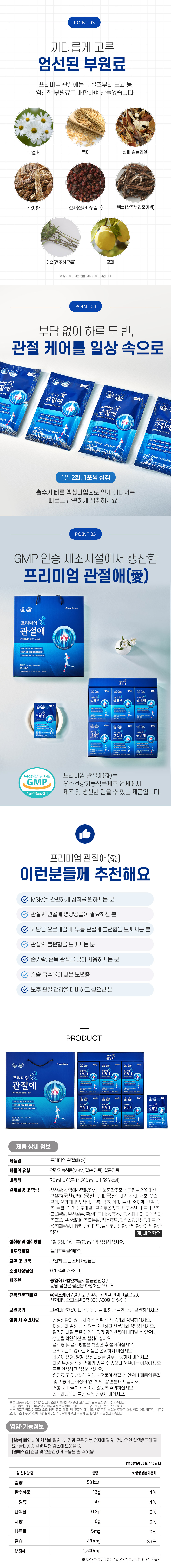 | | | 공급시기 | | 기획공급 | | | 식품유형 | | 건강기능식품(MSM, 칼슘제품) / 살균제품 | | | 생산지 | | 제조원: 농업회사법인(주)글로벌금산진생 / 충남 금산군 금산읍 하영처길 29-16 유통전문판매원: (주)팜스케어 / 경기도 안양시 동안구 안양판교로 20, 신한데뷰오피스텔 3층 305-A30호 (관양동) | | | 원부재료 | | 젖산칼슘, 엠에스엠(MSM), 식물혼합추출액(고형분 2% 이상, 구절초(국산), 맥아(국산), 진피(국산), 사인, 산사, 백출, 우슬, 모과, 오가피나무, 작약, 두충, 감초, 계피, 복령, 숙지황, 당귀, 대추, 독활, 건강, 캐모마일), 프락토올리고당, 구연산, 버드나무추출물분말, 탄산칼륨, 황산마그네슘, 효소처리스테비아, 자몽종자추출물, 보스웰리아추출분말, 맥주효모, 피쉬콜라겐펩타이드, 녹용추출분말, 니코틴산아미드, 글루코사민황산염, 황산아연, 황산망간 / 게, 새우 함유 | | | 중량설명 | | 70ml*60포 (1일 2포 섭취) | | | 포장재질 | | 폴리프로필렌(내면) | | | 소비기한 | | 제조일로부터 730일까지 | | | 보관방법 | | 직사광선을 피하여 서늘한 곳에 보관 | | | 영양·기능정보 | | [칼슘] · 뼈와 치아 형성에 필요 · 신경과 근육 기능 유지에 필요 · 정상적인 혈액응고에 필요 · 골다공증발생 위험 감소에 도움을 줌 [MSM] · 관절 및 연골건강에 도움을 줄 수 있음 1일 섭취량: 2포(140mL), 1일 섭취량 당 함량 (53kcal) 탄수화물 13g(4%), 당류 4g(4%), 단백질 0.2g(0%), 지방 0g(0%), 나트륨 5mg(0%), 칼슘 270mg(39%), MSM 1,500mg * ()안의 수치는 1일 영양성분 기준치에 대한 비율 | |