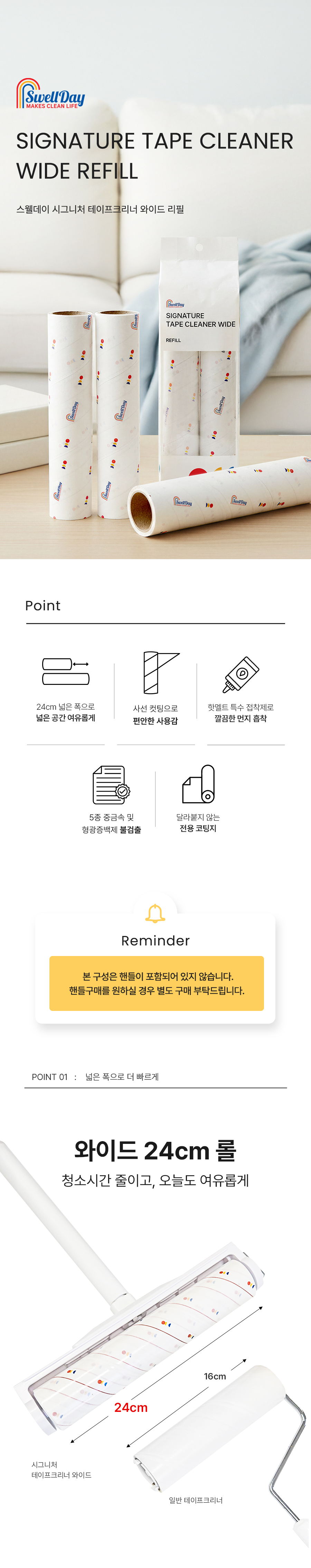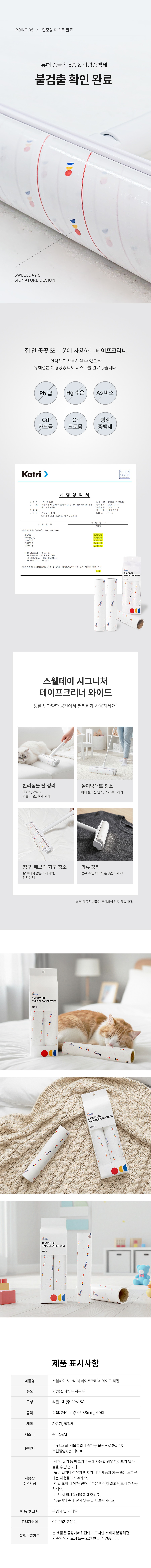 | | | 물품특징 | | 1. 바닥에 달라붙지 않으면서 확실한 접착력과 넓은 면을 한번에 청소할 수 있는 특징 2. 유해 중금속 5종 성분&형광증백제 불검출 3. 핫멜트 안심 접착제 4. 끊김없이 깔끔한 사선 컷팅 | | | 이용방법 | | 와이드형 테이프크리너 본체와 결합하여 비닐을 벗겨낸 뒤 사용합니다. | | | 품질보증기준 | | 본 제품은 공정거래위원회가 고시한 소비자 분쟁해결 기준에 의거 보상 또는 교환을 받을 수 있습니다. | |