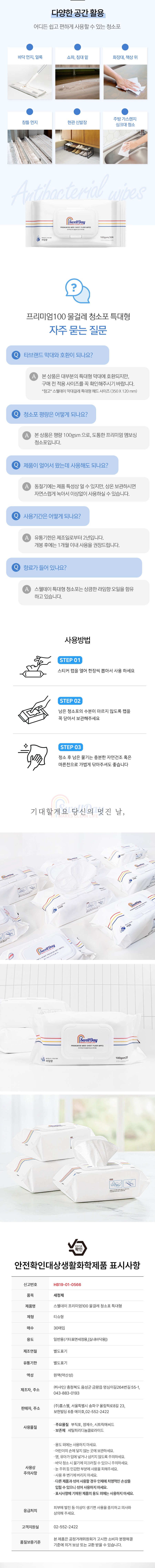 | | | 물품특징 | | 특대형 사이즈, 대요량, 도톰한 엠보싱 원단, 양면사용가능 | | | 이용방법 | | 제품을 한 장씩 뽑아 손걸레 대용으로 사용하거나, 물걸레 밀대에 끼워 놓은 다음 문질러 사용 | | | 주의사 | | 사용상 주의사항 1. 제품의 용도 외에는 사용하지 마십시오. 2. 어린이 손에 닿지 않는 곳에 보관해주세요. 3. 눈, 피부 등 인체에 사용하지 마세요. 4. 다른 제품과 섞어 사용하지 마세요.(인체에 치명적인 손상을 입힐 수 있음) 5. 표시사항에 기재된 제품 용도 외에는 사용하지 마세요 . | |