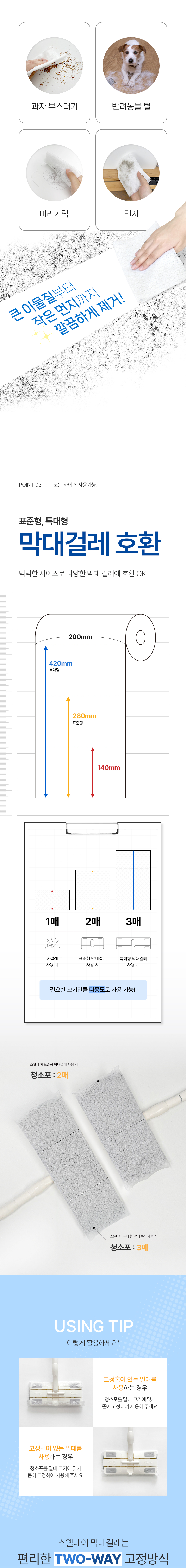 | | | 물품특징 | | 1. 엠보싱 벌집 패턴 원단으로 이물질과 먼지 드의 포집력이 탁월합니다. 2. 자유럽게 다양한 사이즈로 컷팅이 가능합니다 3. 와이드형, 표준형 막대걸레 호환이 가능합니다 4. 양면 사용 가능합니다. 5. 롤형 타입으로 보관 및 사용이 용이합니다 | | | 이용방법 | | 용도에 맞게 절취선을 따라 청소포를 뜯어 사용합니다. | | | 품질보증기준 | | 본 제품은 공정거래위원회가 고시한 소비자 분쟁해결 기준에 의거 보상 또는 교환을 받을 수 있습니다 | |