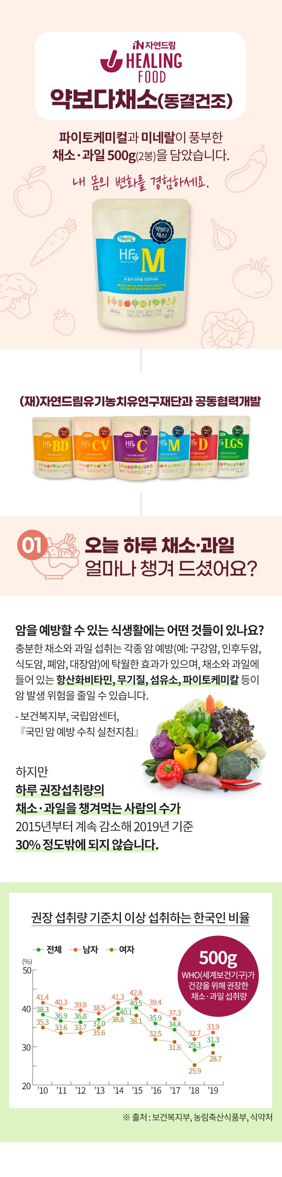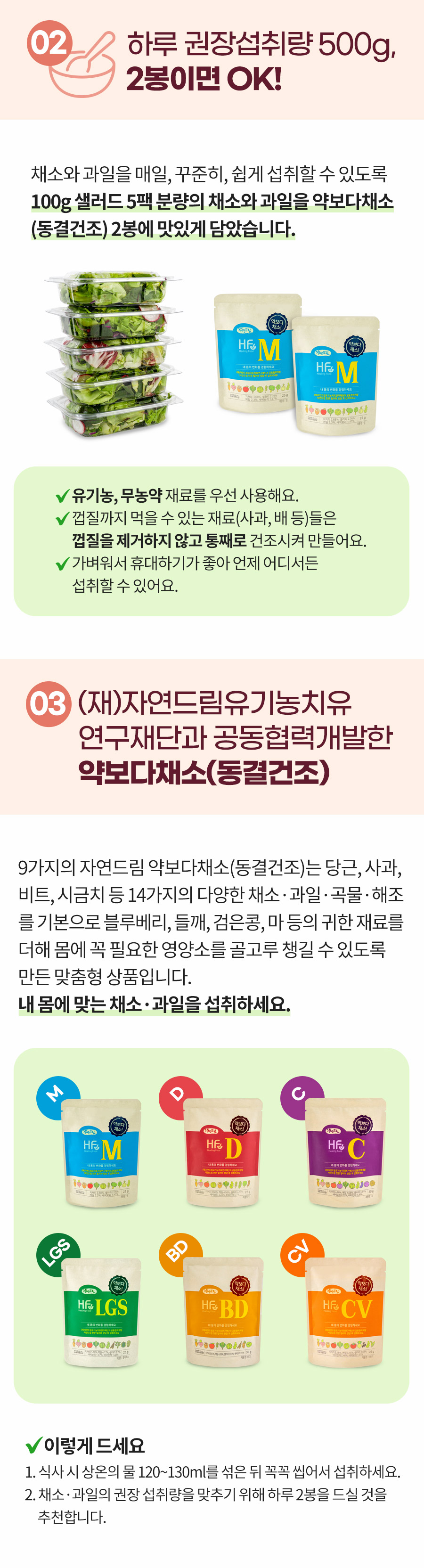 | | | 상품특징 | | 1. 채소와 과일을 동결건조 하였습니다. 2. 뿌리채소 4종, 잎채소 8종, 과일 2종으로 미량영양소(비타민, 미네랄)와 식이섬유가 풍부합니다. 3. 자연드림 '숨' 음료를 첨가하였습니다. | | | 생산과정 | | 원료입고 및 검사 --> 전처리/계량 --> 동결건조 --> 동결건조된 원료 선별/배합 --> 계량 / 포장 --> X-ray 및 금속 검출기통과 --> 검수 / 출고 | | | 이용방법 | | 본 제품에 상온수 120~130ml 를 섞어 섭취하는 것이 적정하며, 본인의 기호에 맞게 물의 양은 가감해도 좋습니다. 식사 시, 하루 1~2개 섭취해주세요. | | | 기타사항 | | 이 제품은 토마토, 대두, 밀, 메밀, 새우를 사용한 제품과 같은 제조시설에서 제조하였습니다. 소비기한이 1년 이상 남은 제품으로 공급됩니다. | |