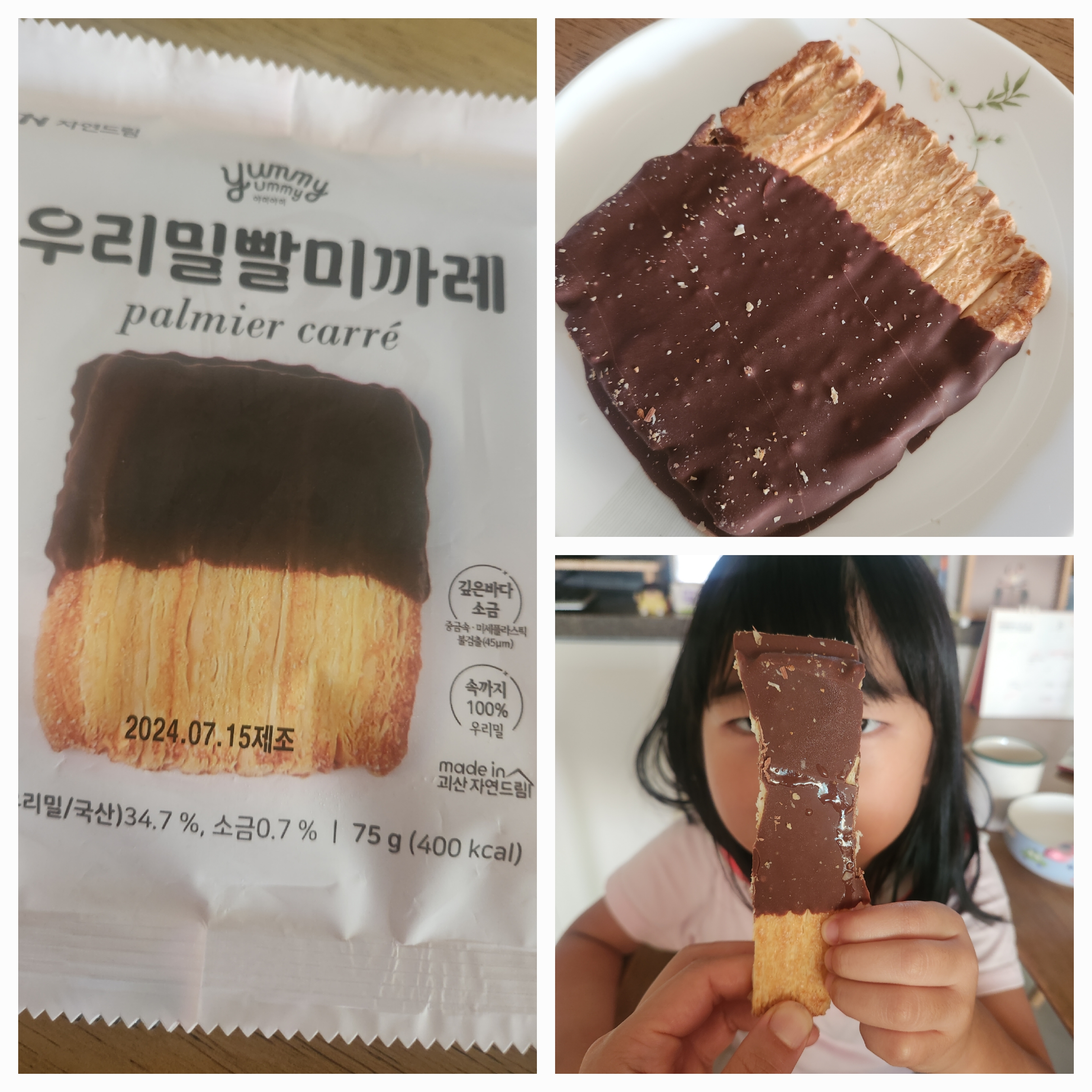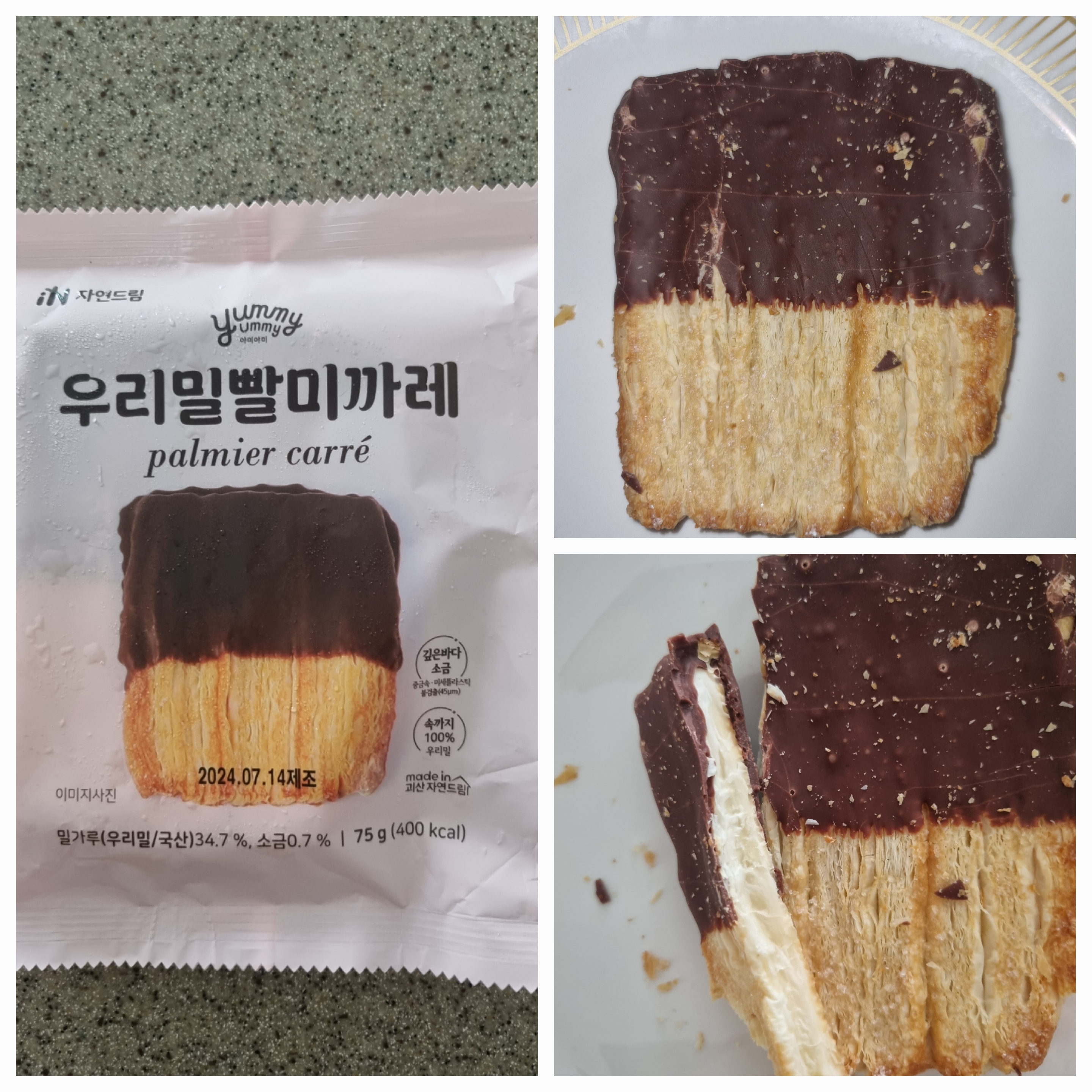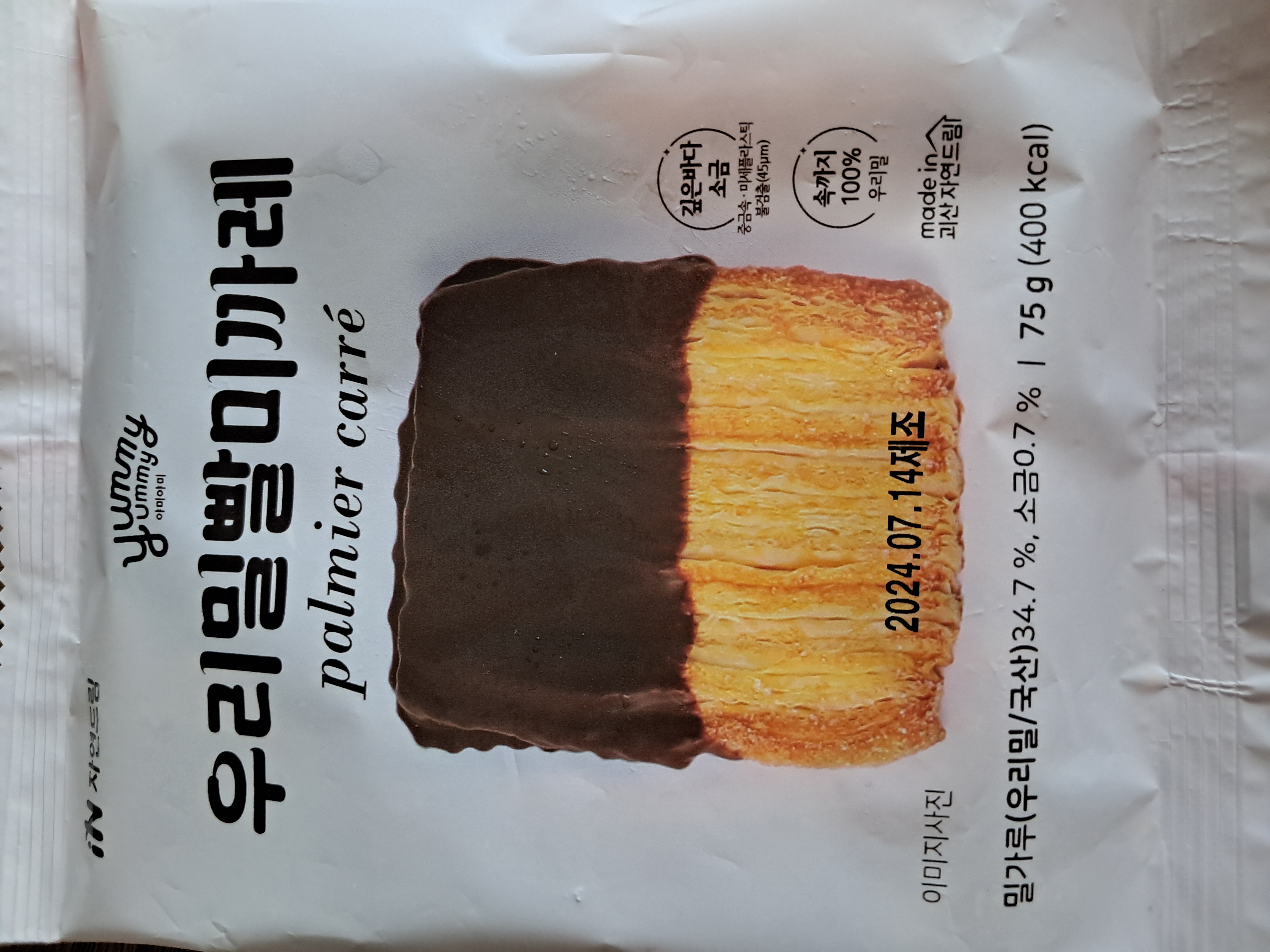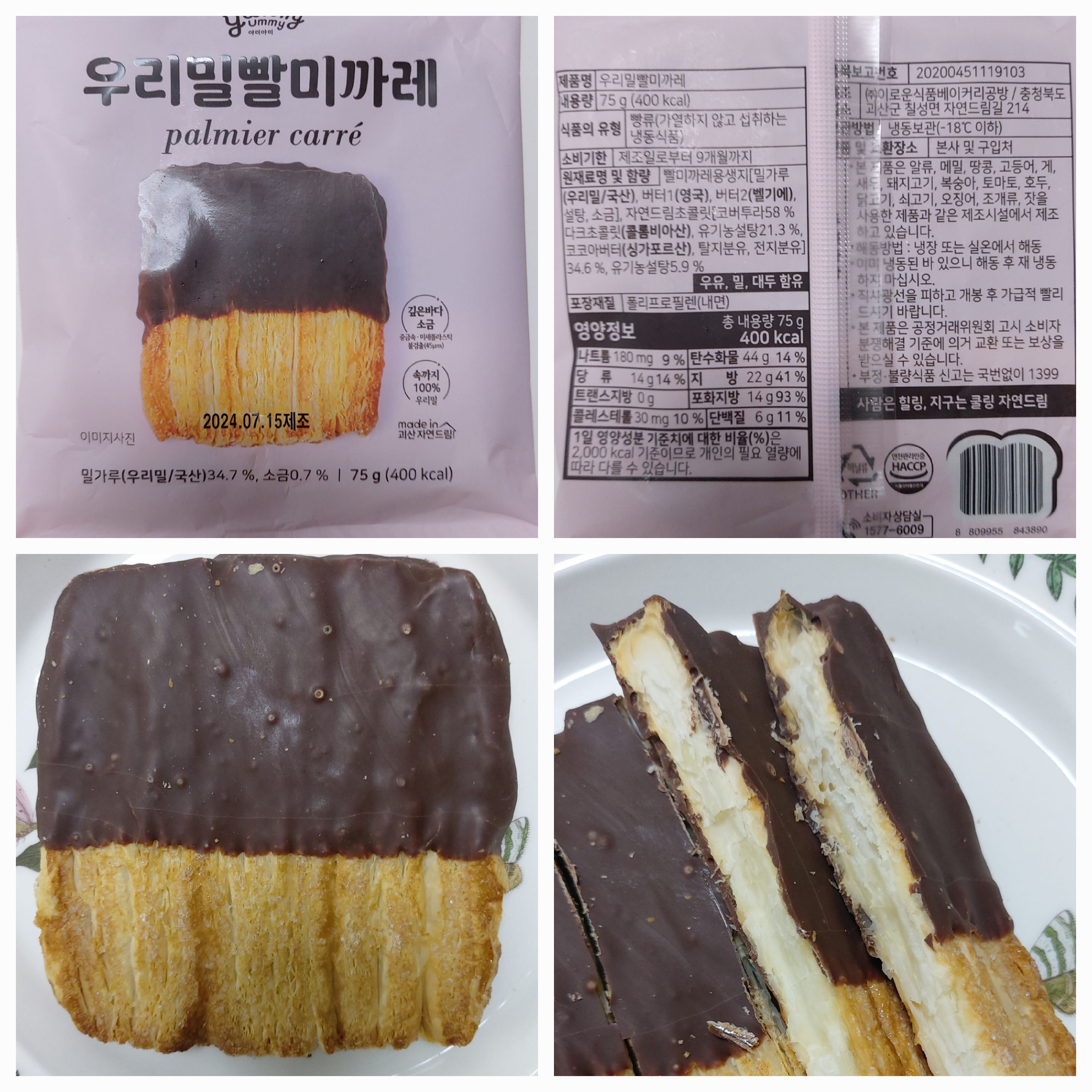 | | | 공급시기 | | 상시공급 | | | 식품유형 | | 빵류(가열하지않고 섭취하는 냉동식품) | | | 생산지 | | 1. 생산지명 : ㈜이로운식품 베이커리 공방 2. 주소 : 충청북도 괴산군 칠성면 자연드림길 214 | | | 원부재료 | | 빨미까레용생지[밀가루(우리밀/국산), 버터1(영국), 버터2(벨기에), 설탕, 소금], 자연드림초콜릿[코버투라58%다크초콜릿(콜롬비아산), 유기농설탕21.3 %, 코코아버터(싱가포르산), 탈지분유, 전지분유]34.6 %, 유기농설탕5.9 % [우유,밀,대두 함유] | | | 포장재질 | | 폴리프로필렌(내면)