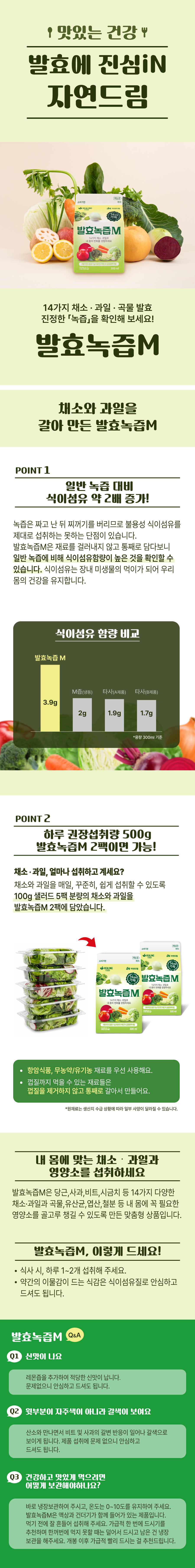 | | | 물품특징 | | 1. 엄선된 14가지 채소,과일과 곡물, 해조, 유산균, 철분, 엽산 등의 재료로 몸에 꼭 필요한 영양소를 골고루 챙길 수 있도록 만든 맞춤형 상품입니다. 2. 하루 필요한 채소,과일 권장섭취량(생채) 500g을 2팩에 담았습니다. 3. 채소,과일을 갈아 식이섬유함량이 높습니다. | | | 이용방법 | | 식사 시, 하루 1~2개 섭취 해주세요 | | | 생산과정 | | 원료입고 → 세척 및 정선 → 배합 → 살균 → 충진 → 포장 | | | 기타사항 | | 1. 변질 및 변색의 우려가 있으니 반드 시 냉장보관하시고, 개봉한 제품은 가급적 빠르게 드십시요. 2. 느린 발효를 원하시는 경우 저온(0~5℃) 보관을 권장합니다. 3. 개봉 후 갈변현상으로 보이는 이유는 개봉 후 사과 및 비트가 산소와 만나는 갈변현상이므로 이취가 나지 않는다면 섭취하시어도 무방합니다. 4. 이 제품은 알류,메밀,땅콩,밀,새우,돼지고기,쇠고기,토마토,호두,오징어,조개류,잣을 사용한 제품과 같은 시설에서 제조하였습니다. | |
