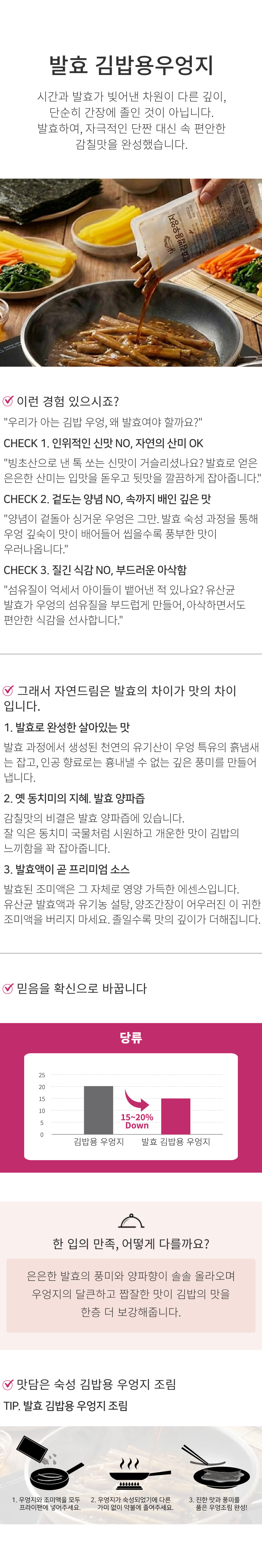 | | | 물품특징 | | 1. 무농약 우엉을 사용하였습니다. 2. 발효된 우엉지와 양파즙이 만나 깊은 풍미를 가집니다. 3. 오랜 기간 숙성시켜 우엉에 맛이 골고루 배어 맛이 좋으며, 조미액과 함께 볶아 드시면 진한 맛과 풍미를 즐기실 수 있습니다. | | | 이용방법 | | 1. 김밥의 재료 또는 반찬용으로 드셔도 좋습니다. 2. 우엉지 내 조미액을 바리지 마시고 우엉과 함께 볶아 드시면 풍미가 진해져 더욱 맛있습니다. | | | 생산과정 | | 원재료 입고 - 전처리 - 세척 - 염절임 - 탈염 - 계량 - 발효 - 조미액 충진 - 포장 - 살균 - 보관 - 출하 | | | 기타사항 | | 칼 등으로 포장지를 제거할 경우 손을 다치지 않게 조심하세요. | |