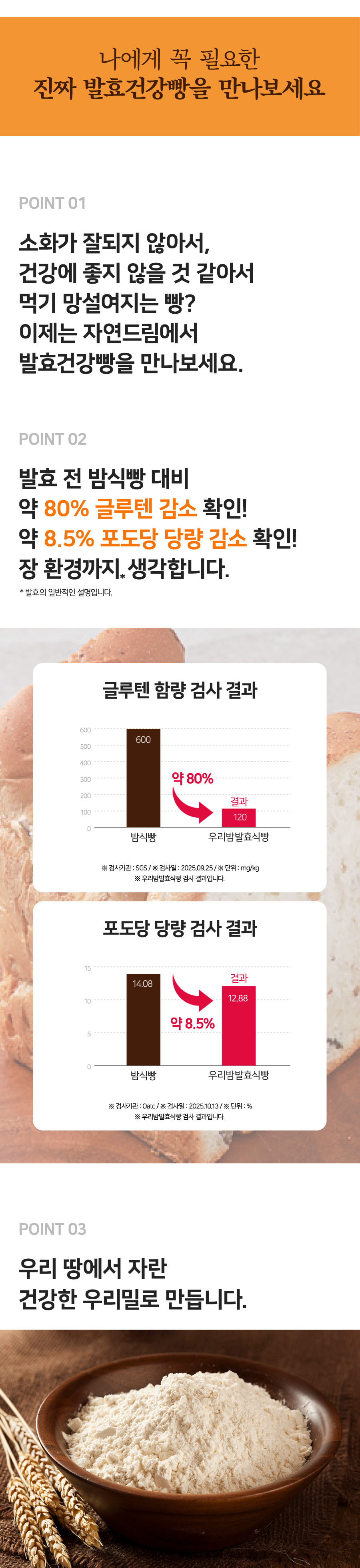 | | | | 물품특징 | | 1. 속까지100% 우리밀과 국산 밤으로 만들어 더 부드럽고 달콤한 우리밤발효식빵입니다. 2. 우리밀효모종과 유산균 발효로 식빵의 풍미는 살리고 글루텐과 포도당 당량은 낮췄습니다. 3. 유산균으로 발효한 식빵은 글루텐 약 80%, 포도당 당량 약 8.5%가 감소되어 부담없이 즐길 수 있습니다. | | | 이용방법 | | 1. 식빵 그대로 드시거나 토스트기에 구워 간단하게 드시면 좋습니다. 2. 취향에 따라 버터나 크림치즈, 스프레드 등을 발라 드시거나 우유 또는 음료 등과 함께 드시면 더욱 맛있게 즐기실 수 있습니다. 3. 식빵 사이에 야채, 햄, 치즈, 과일 등을 올려 샌드위치로 이용하시면 한끼식사로 좋습니다. 4. 낫또를 얹어 드시면 낫또 특유의 풍미를 더욱 진하게 느끼실 수 있습니다. | | | 생산과정 | | 원재료 계량 → 믹싱 및 혼합 → 분할 → 중간 발효 → 성형 → 2차 발효 → 소성 → 냉각 → 슬라이스 → 포장 → 출고 | | | 기타사항 | | 이 제품은 알류, 토마토, 닭고기, 소고기, 돼지고기, 오징어, 복숭아, 게, 새우, 고등어, 메밀, 잣, 호두, 땅콩, 조개류를 사용한 제품과 같은 제조시설에서 제조하였습니다. | |
