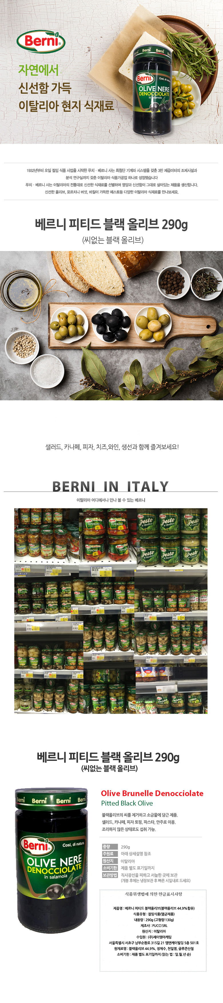 | | | 공급시기 | | 기획공급 | | | 식품유형 | | 절임류(살균제품) | | | 생산지 | | 이탈리아 | | | 원부재료 | | 블랙올리브44.9%, 정제수 천일염, 글뤀콘산철 | | | 중량설명 | | 290g(고형량:130g) | | | 포장재질 | | 유리,철(뚜껑) | | | 소비기한 | | 제품에 별도 표기한 날짜까지(제조일로부터 36개월까지) | | | 보관방법 | | 직사광선으 피하고 서늘한 곳에 보관 | | | 영양성분표시 | | 1회제공량 100g 열량 127kcal 포화지방 2.2g 탄수화물 0.0g 지방 13.0g 당류 0g 단백질 1.0g 나트륨 1.5g | |