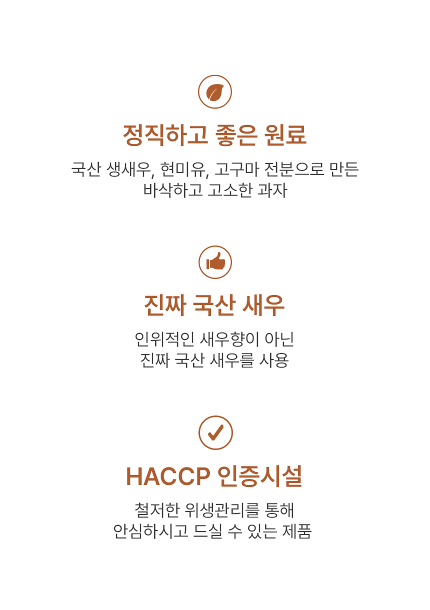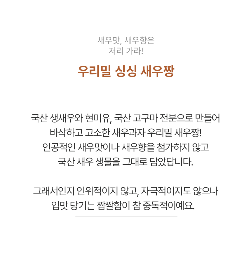 | | | 물품특징 | | 1. 믿을 수 있는 국산 원료 사용 - 우리밀에 국산 새우, 고구마전분, 쌀가루를 더해 만든 안심간식 입니다. 2. 새우함량 9.13% - 새우의 고소한 풍미를 느낄 수 있습니다. 3. 기름까지 건강하게 - 팜유, 대두유 대신 현미유를 사용하여 더욱 깔끔하고 부담없는 맛을 완성 했습니다. 4. 팽창제 없이 부드러운 식감 - 팽창제를 넣지 않고 만들어 식감은 부드럽고 먹고 난뒤에도 속이 편안한 과자입니다. | | | 생산과정 | | | | | 이용방법 | | | | | 기타사항 | | | |