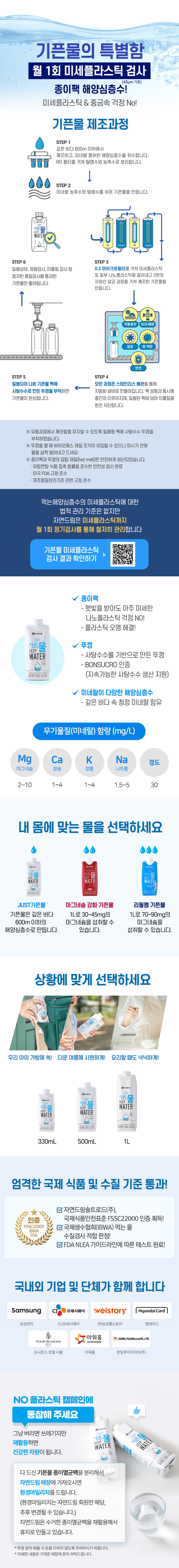 | | | 상품특징 | | JUST기픈물에는 자연상태의 해양심층수의 미네랄이 함유되어 있습니다. | | | | 생산과정 | | 원수 자외선 살균 → 탈염수 저장 → 미네랄 용해 → 블렌딩 → 자외선 살균 → 필터링 → 먹는해양심층수 저장 → 자외선 살균 → 충진 → 포장 → 검사 후 출하 | | | 이용방법 및 주의사항 | | *제품에 직접 입을 대고 음용 시, 입 안의 이물이 제품 내 혼입될 수 있으므로 주의하시기 바랍니다. *가방 내 제품 보관 시, 종이팩이 파손될 수 있으므로 보관 시 주의하시기 바랍니다. *직사광선을 피해 깨끗하고 건조한 곳에 보관하시기바랍니다. *뚜껑을 열었을 때에는 미생물이 증식할 우려가 있으므로 가급적 짧은 기간에 소비하시기 바랍니다. 개봉 후에는 냉장보관하시기 바랍니다. *용기째 가열 또는 동결하지 마시기 바랍니다. 끓이거나 얼렸을때 백색 침전물이 생길수 있으나 천연미네랄성분이므로 품질에는 문제가 없습니다. *뚜껑 개봉 시, 종이팩 원단 내부의 빛 차단 목적으로 들어가는 알루미늄이 뚜껑 톱니에 잘려 내부에 혼입될 가능성이 있습니다. 음용 시 알루미늄박이 확인될 경우 음용하지 마시고 반품 요청드립니다. *기픈물 섭취 시 속뚜껑을 삼키지 않도록 주의하시기 바랍니다. *섭취 후 분리수거를 위해 뚜껑 분리 시 뚜껑 톱니바퀴에 손이 베이지 않도록 주의하시기 바랍니다. *유통 과정에서 깨끗함을 유지할 수 있는 사탕수수 뚜껑을 사용하였습니다. *뚜껑을 열 때 바이오매스 재질 조각이 유입될 수 있으니 마시기 전에 물을 살짝 덜어내고 드세요. | | | 기타사항 | | 본 제품은 소비자 분쟁 해결기준(공정위 고시)에 의거 교환 또는 보상 받을 수 있습니다.